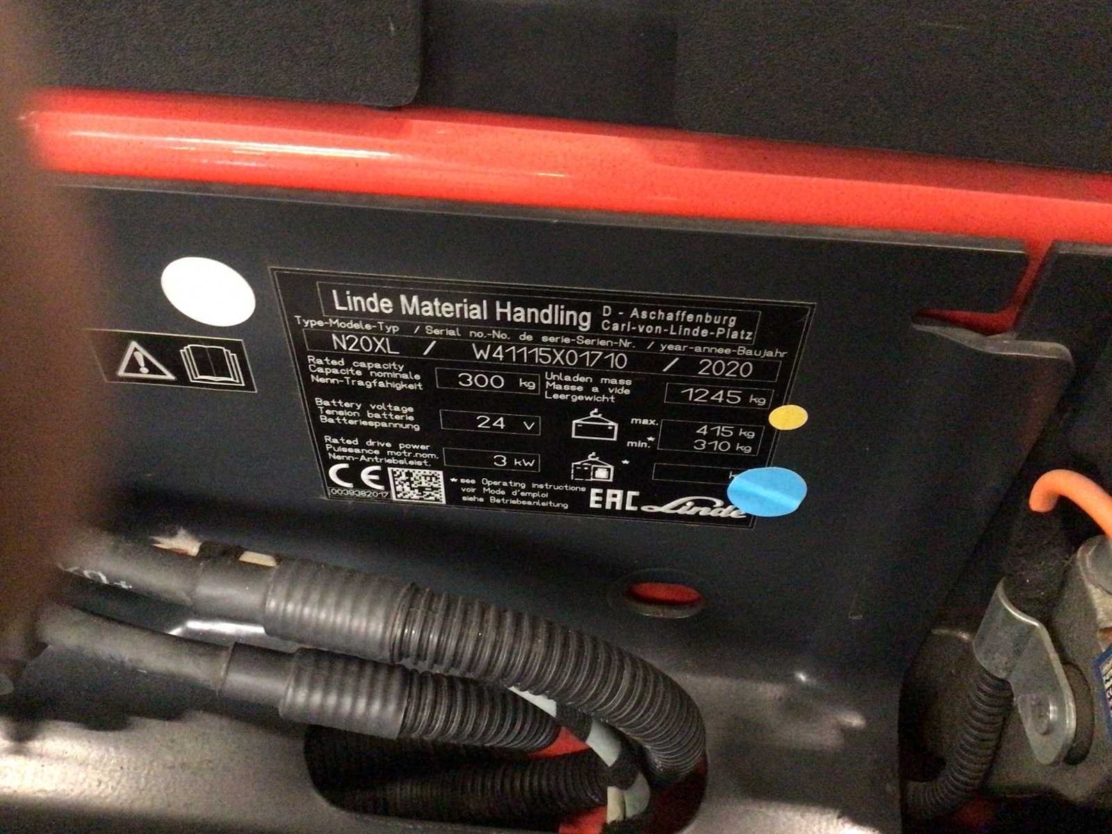 Merk: Linde Type: N20XL Bouwjaar: 2020 Serienummer: W41115X01710 Hefvermogen: 300kg Hefhoogte: 840mm Lepellengte: 2400mm Afgelezen urenstand: 172 Eigen gewicht: 1245kg Minimale doorrijhoogte: 1800mm Totale afmeting L: 4100mm Totale afmeting Breedte: 800mm Meerij stapelaar: true Accu lader: true