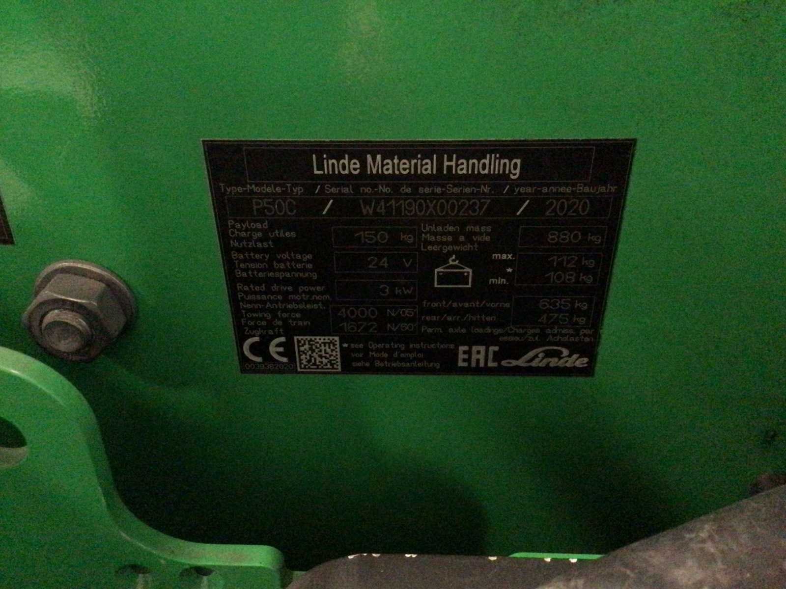 Machine werkend, Accu leeg. Merk: Linde Type: P50C Bouwjaar: 2020 Serienummer: W41190X00232 Trekcapaciteit: 150kg Eigen gewicht: 880kg Totale afmeting L: 1700mm Totale afmeting Breedte: 850mm Totale afmeting Hoogte: 1800mm