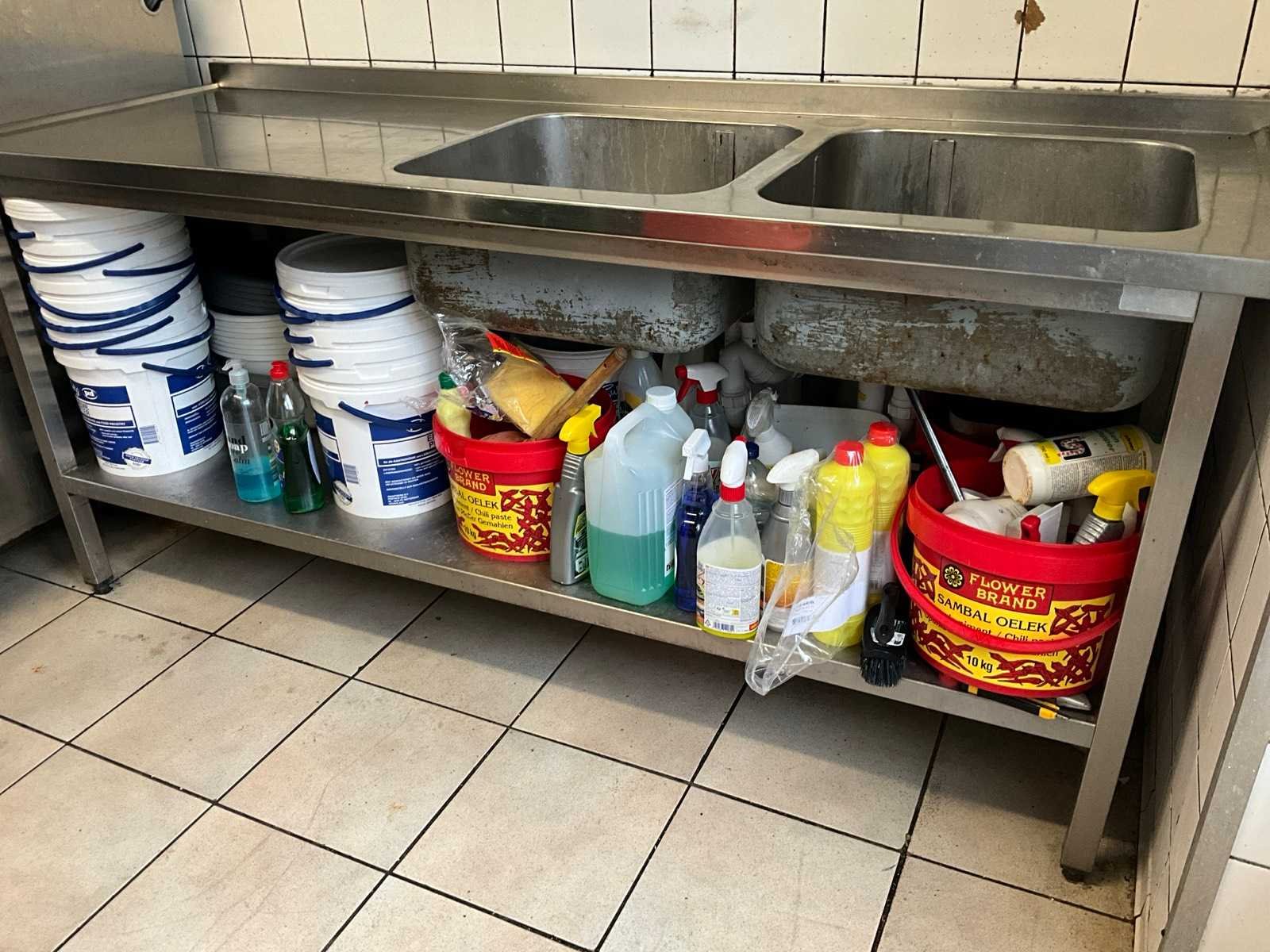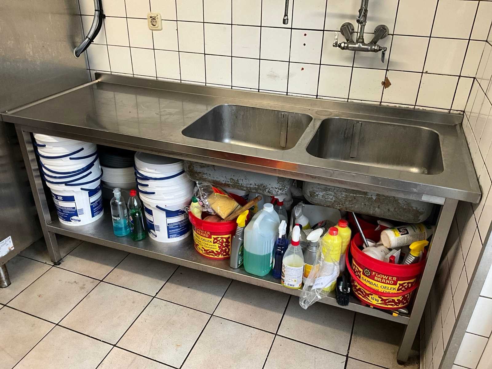Zonder kraan; voorzien van diverse emmers en schoonmaakartikelen Aantal spoelbakken: 2pcs Afmeting spoelbak: 50cm Rvs: true Lengte: 200cm Breedte: 70cm Hoogte: 90cm