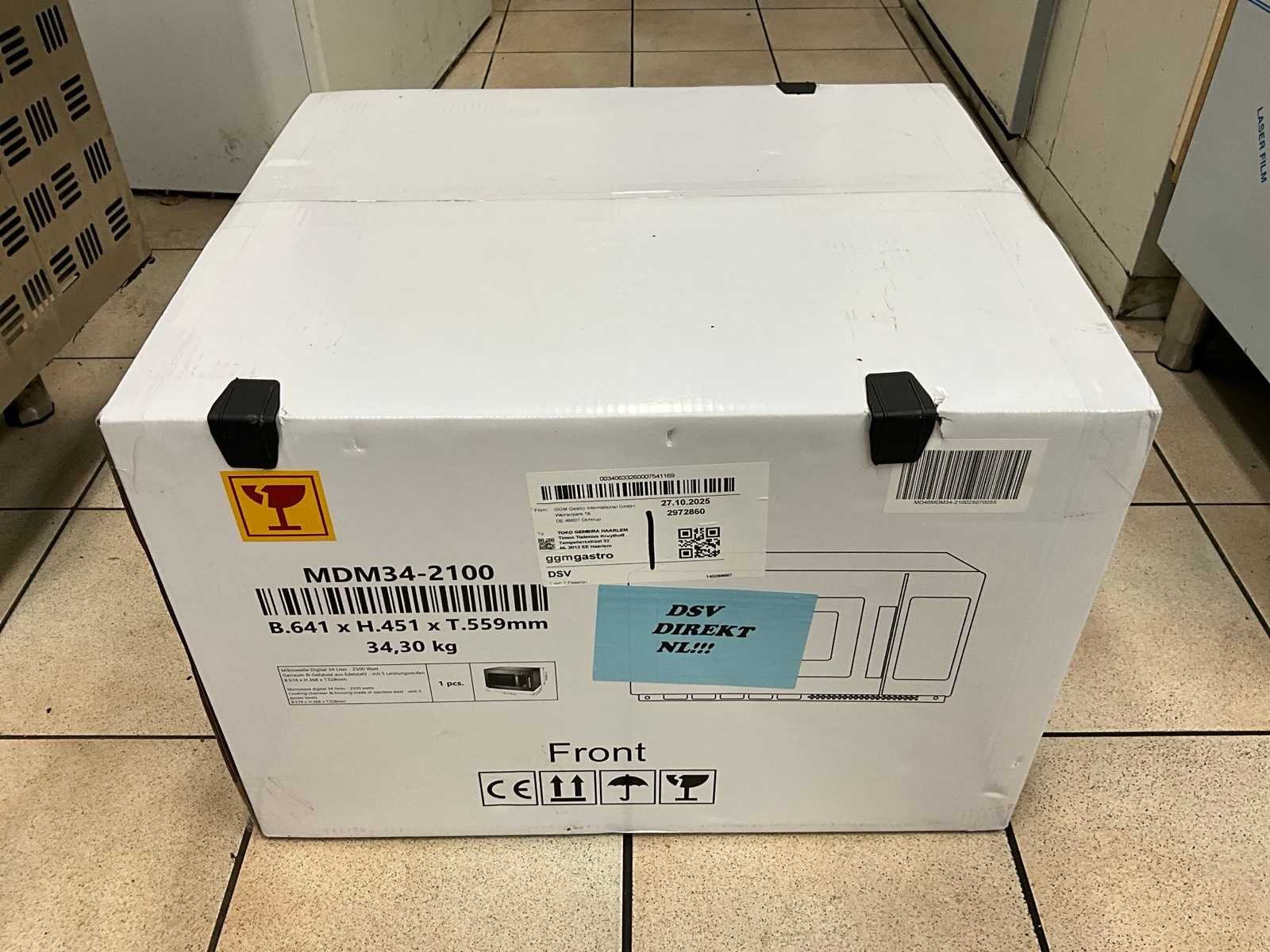 Ongebruikt in doos; inhoud 34L Merk: GGM Gastro Type: MDM34-2100 Totale afmeting L: 57cm Totale afmeting Breedte: 53cm Totale afmeting Hoogte: 37cm Vermogen: 2100W Rvs: true Aansluiting: 230V