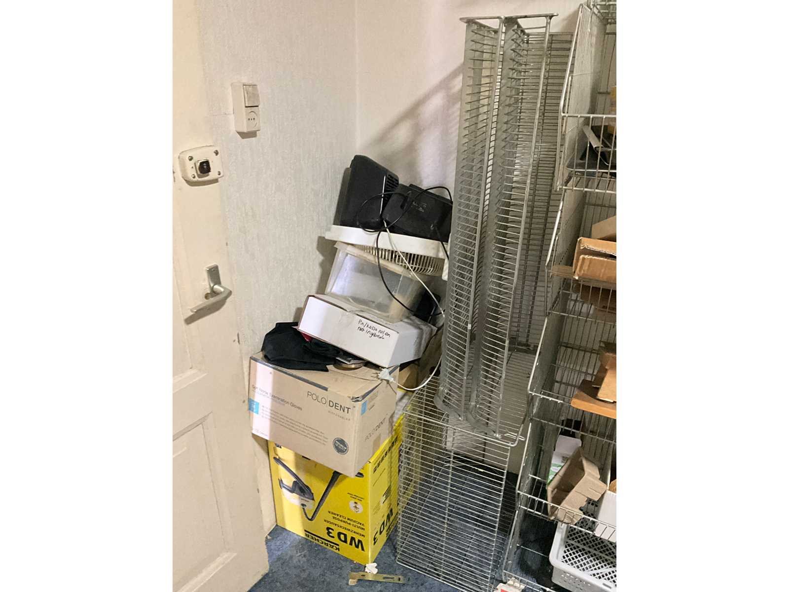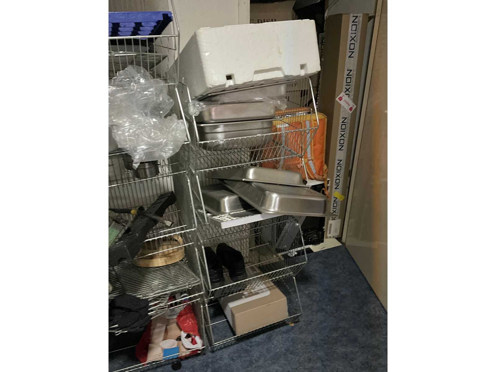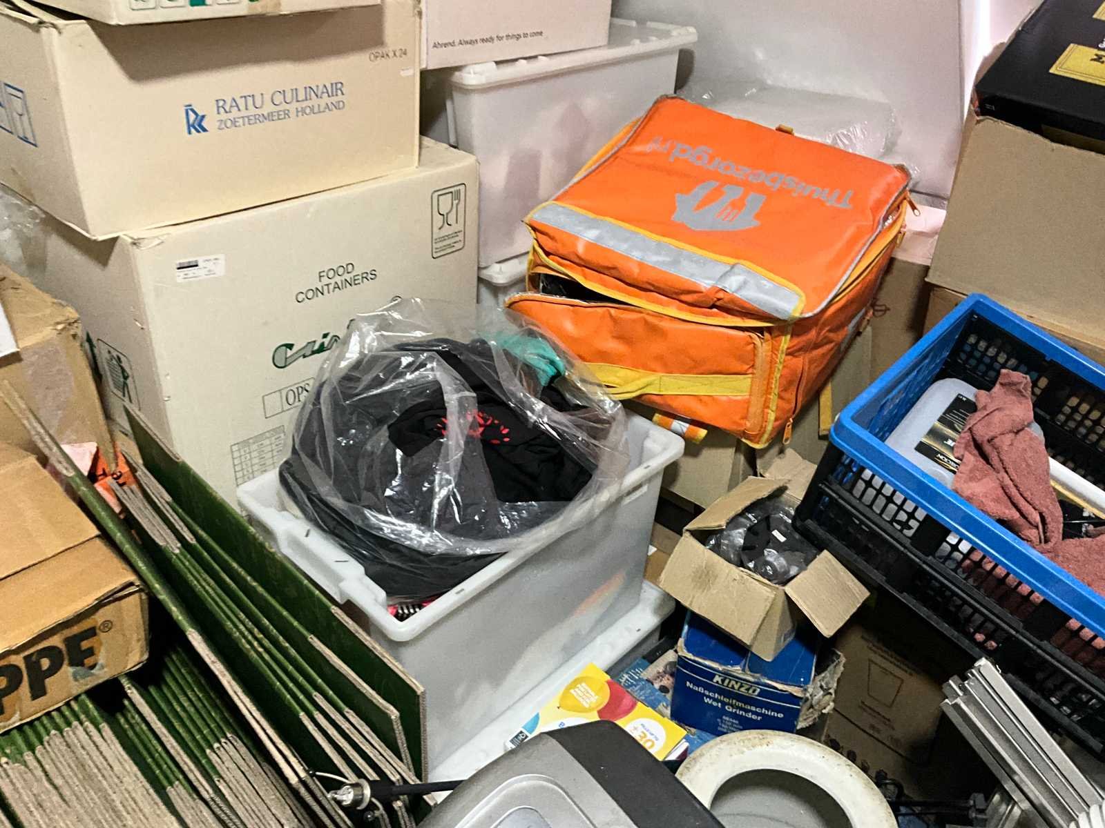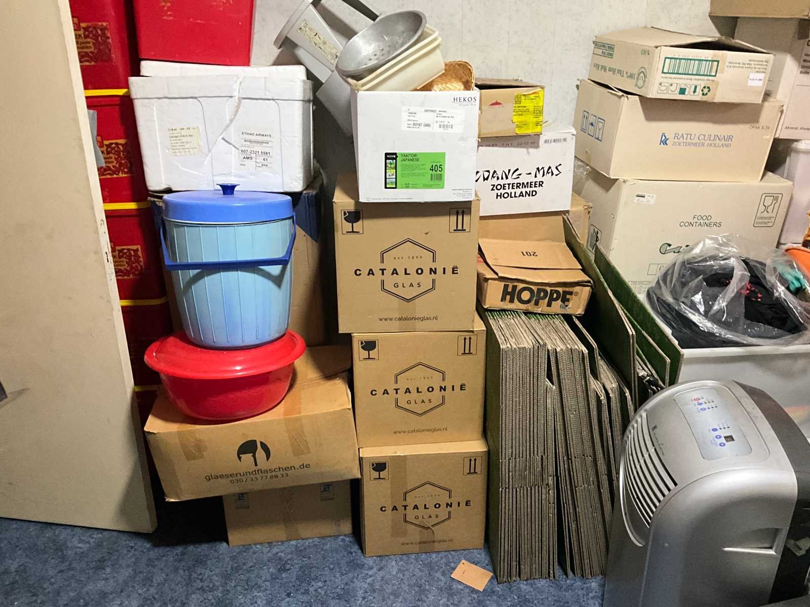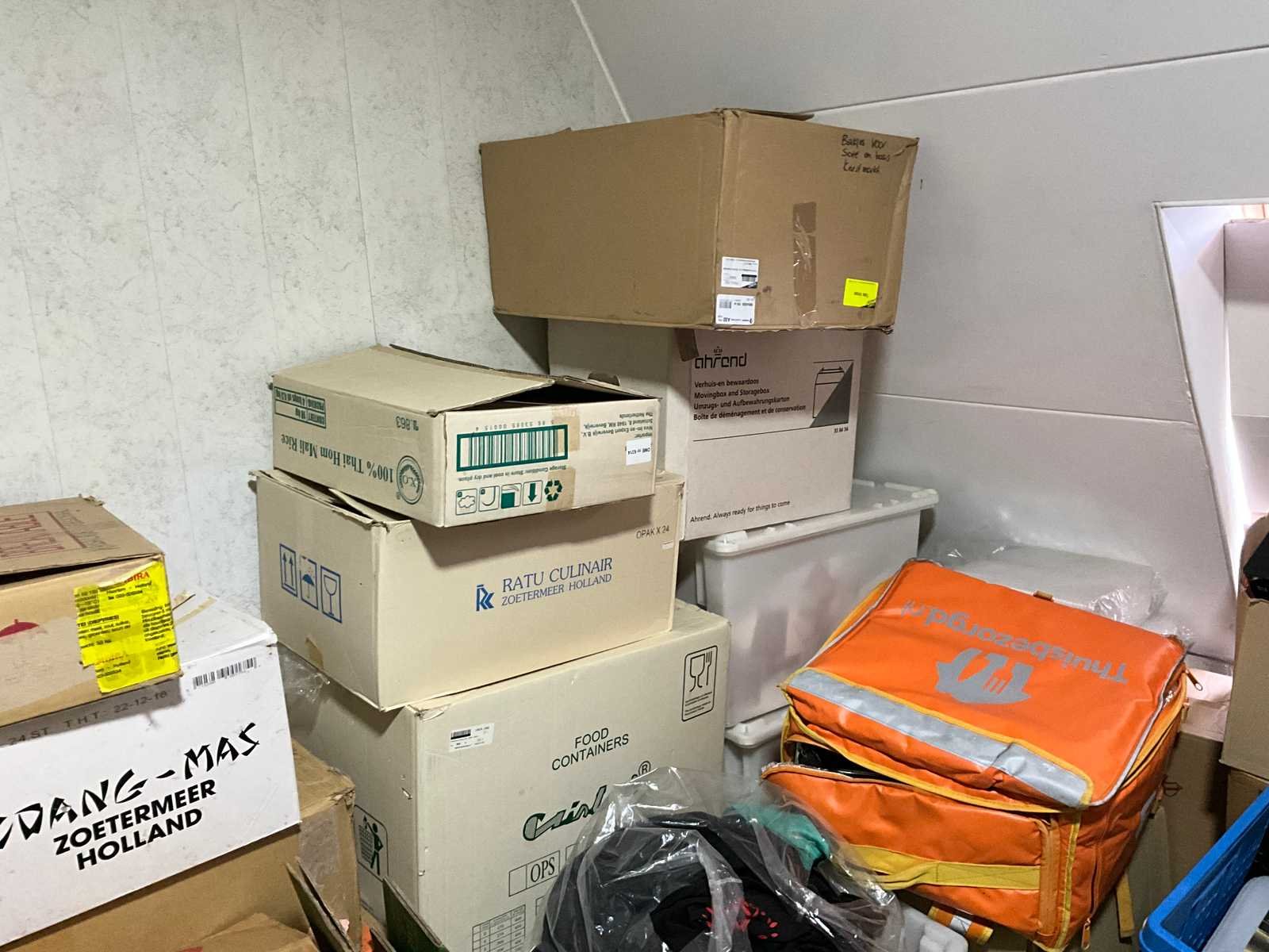 Waaronder servies; glazen; disposables; warmhoudbakken; draadmanden; 2x “Auping” spiraalbodem; schoonmaakartikelen etc.