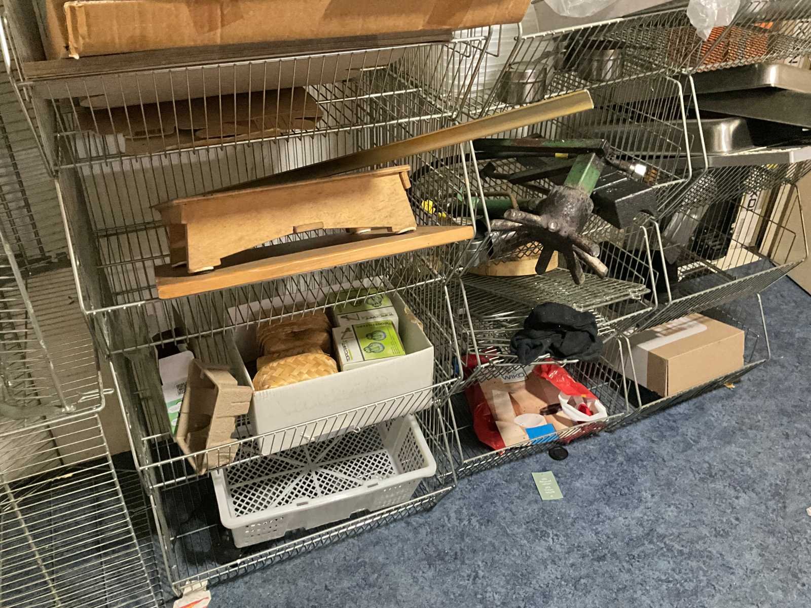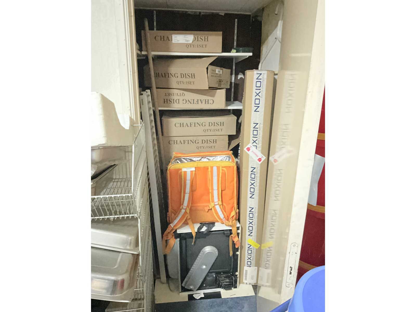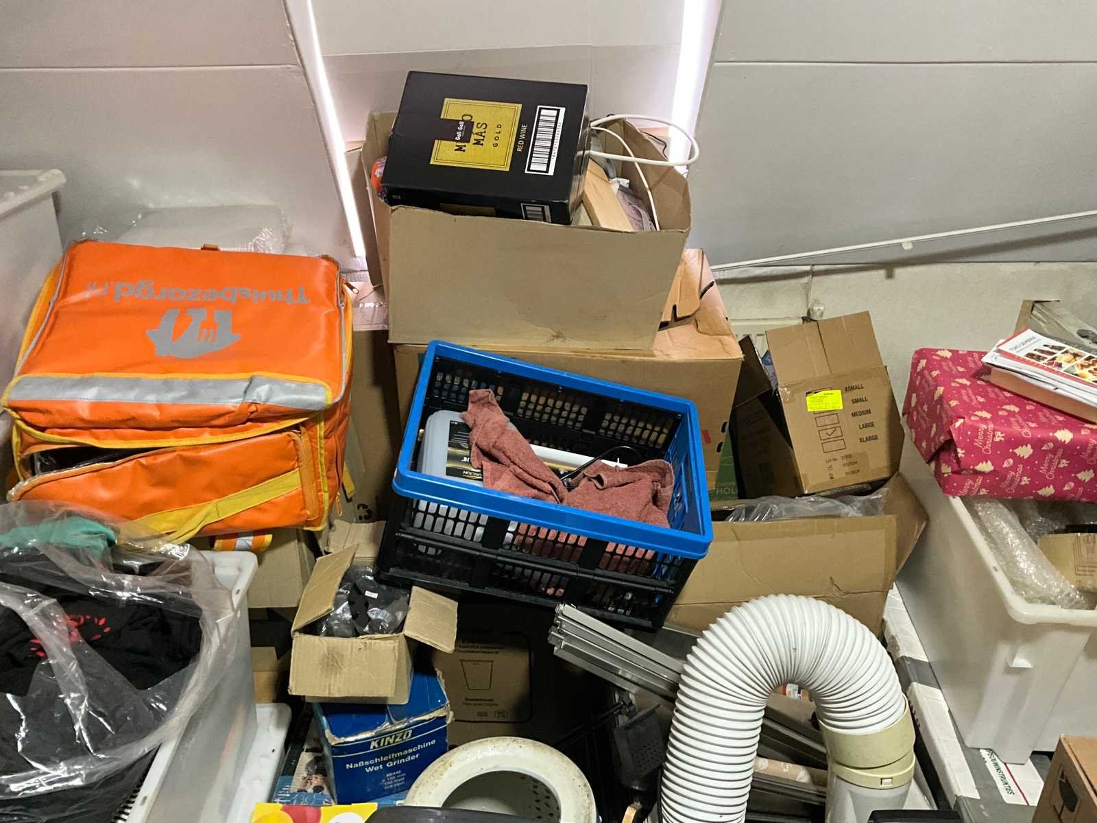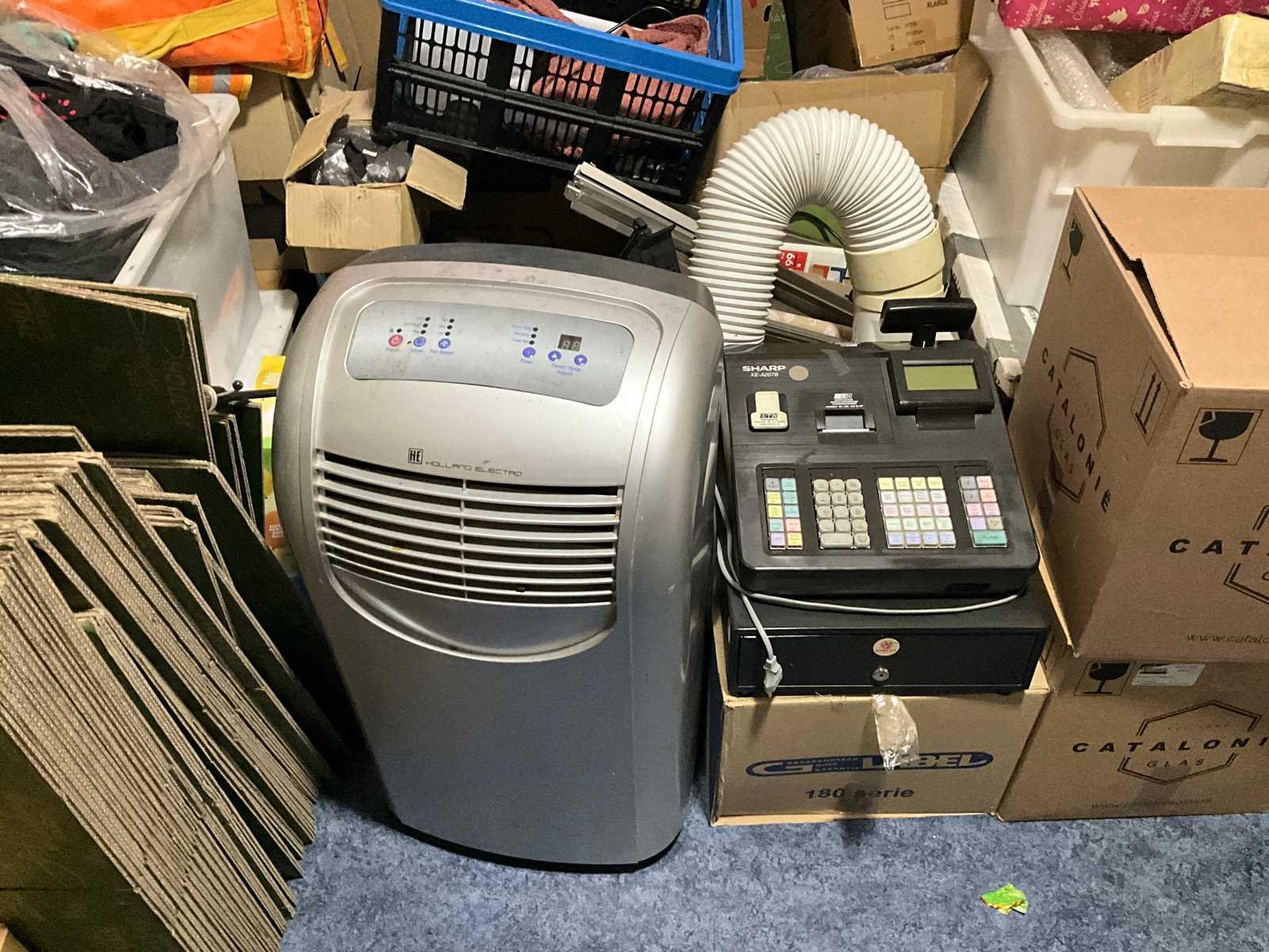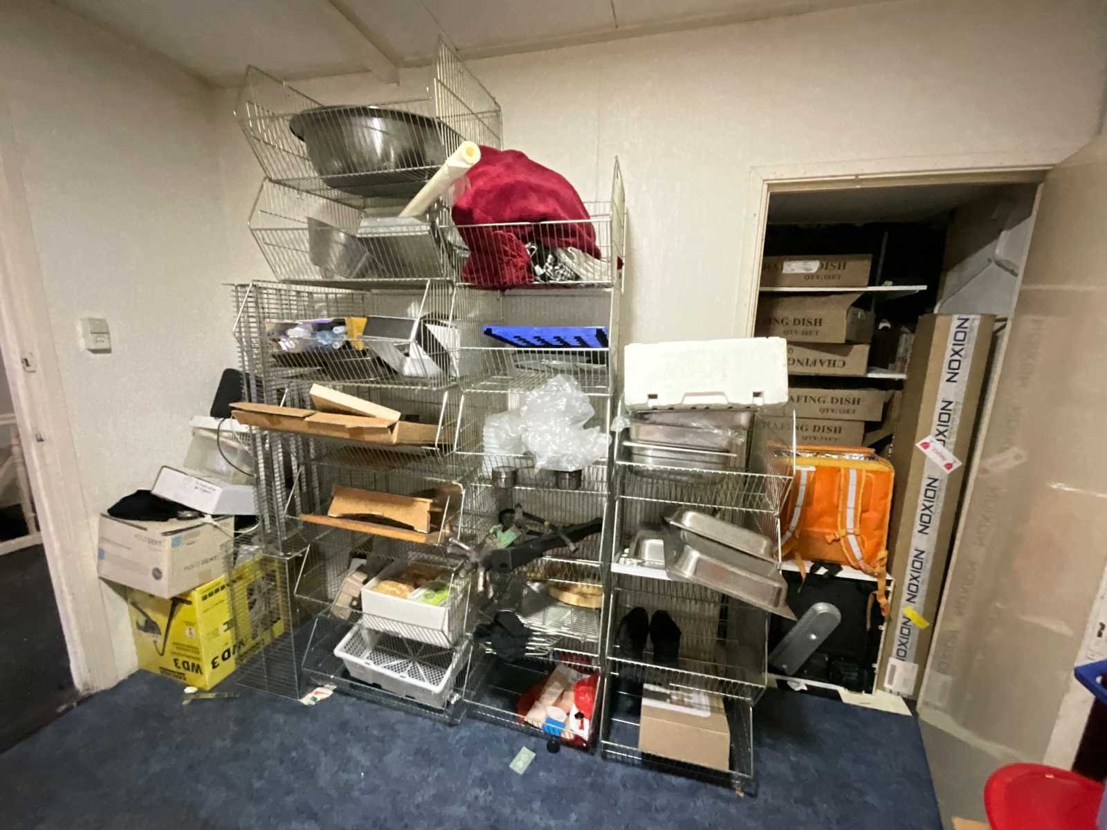 Waaronder servies; glazen; disposables; warmhoudbakken; draadmanden; 2x “Auping” spiraalbodem; schoonmaakartikelen etc.