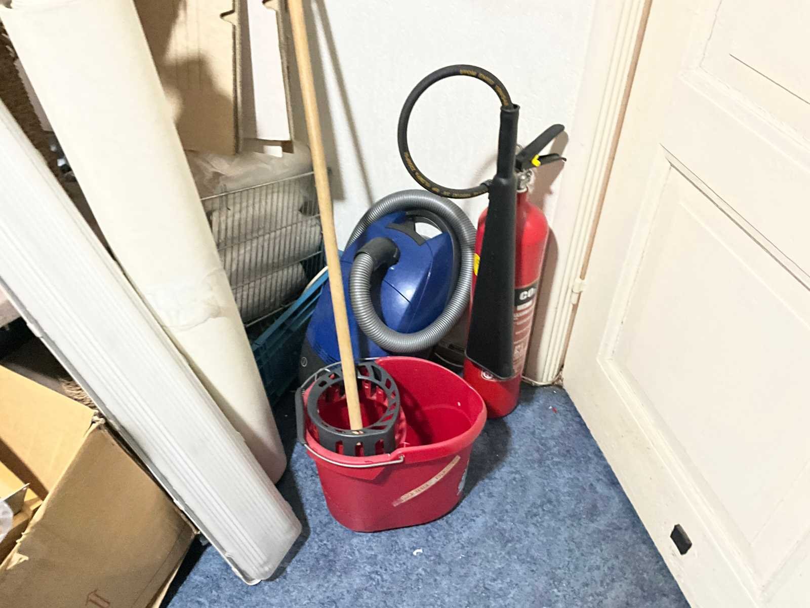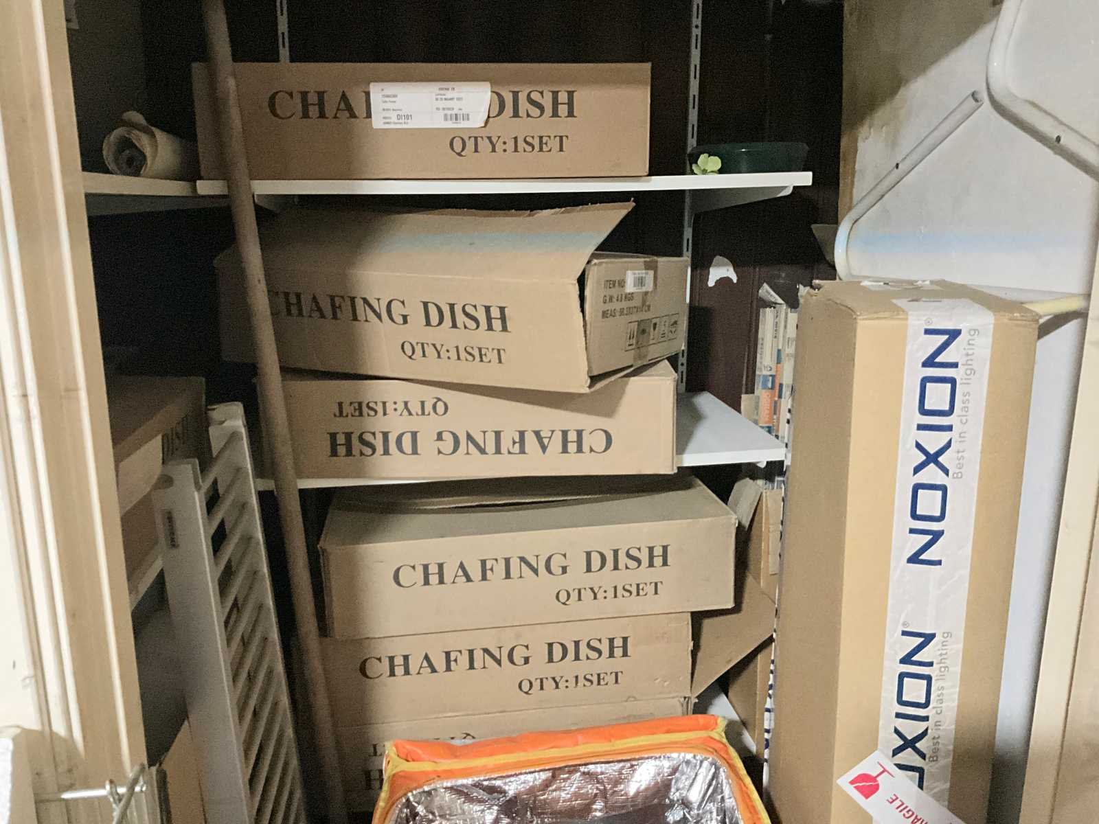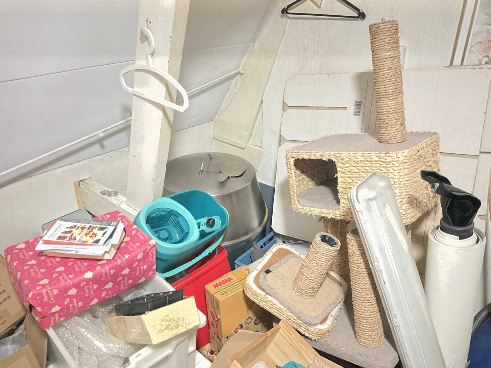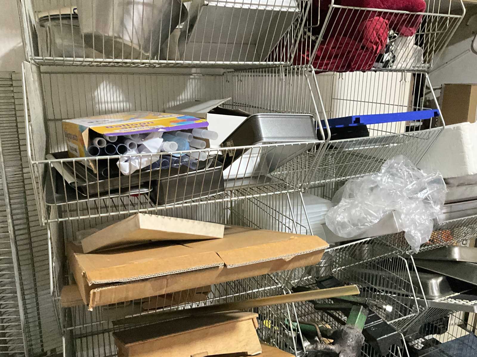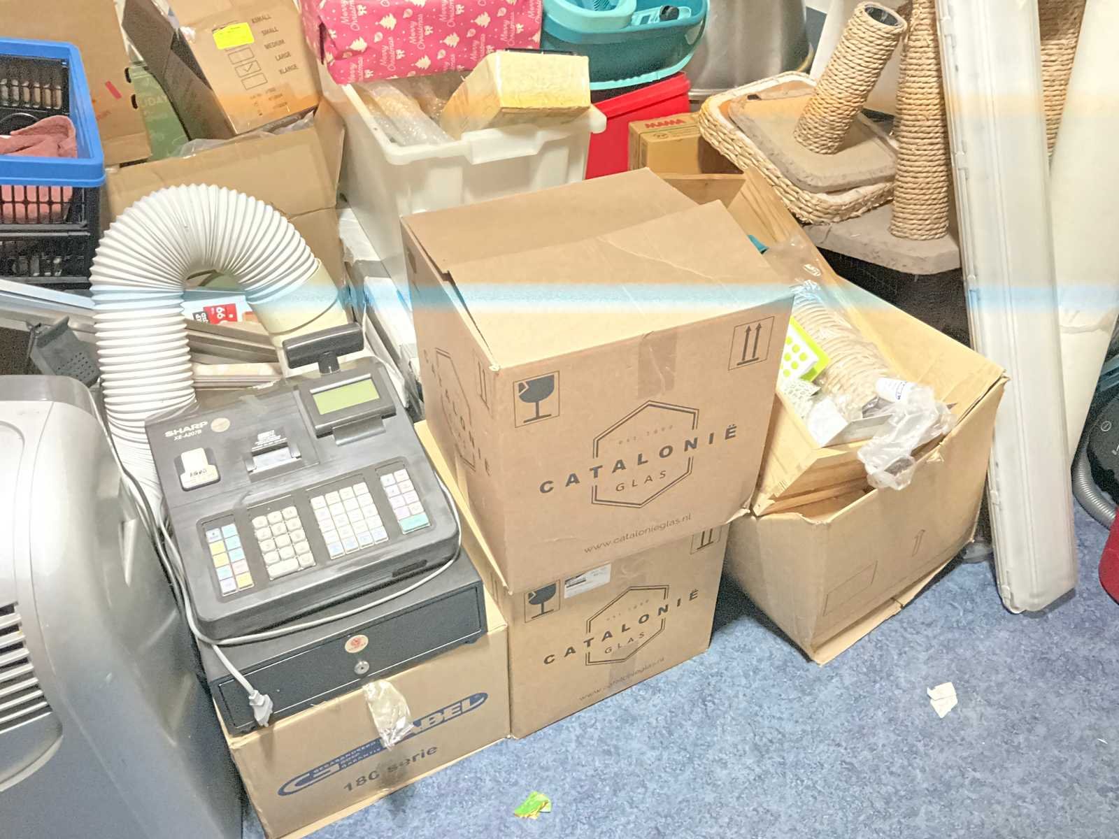 Waaronder servies; glazen; disposables; warmhoudbakken; draadmanden; 2x “Auping” spiraalbodem; schoonmaakartikelen etc.