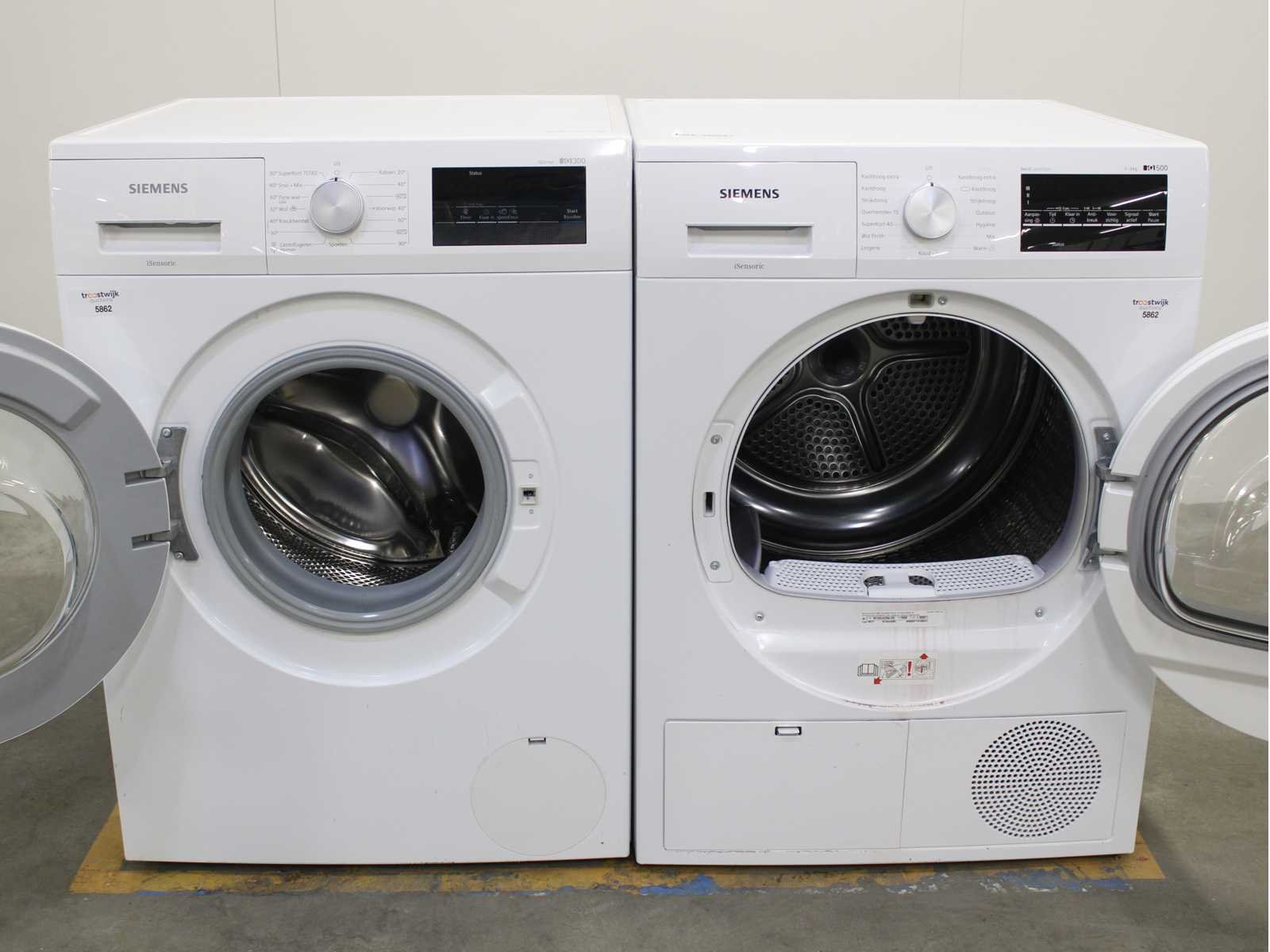 Deze wasmachine en wasdroger komen uit een partij jong gebruikt A-Merk witgoed. De machines zijn volledig getest, gereinigd en indien nodig gerepareerd. Houdt er rekening mee dat de machines lichte gebruikssporen kunnen hebben. Wasmachines en wasdrogers hebben vaak standaard afmetingen. Hoogte 85cm, Breedte 60cm en Diepte 60 tot 70cm, incl. uitstekende slangen e.d. aan de achterzijde. Als de machine vrij komt te staan is de afmeting minder relevant. Wil je de machine in een nis plaatsen of inbouwen? Controleer dan de exacte afmetingen op basis van het aangeboden merk en model/type. Within 7 days Merk: Siemens Serienummer: WM14N030NL/14 en WT46G4G0ML