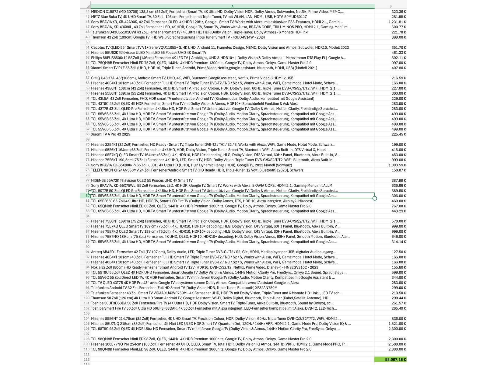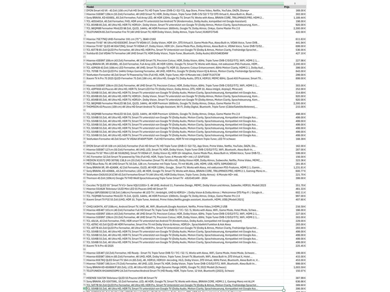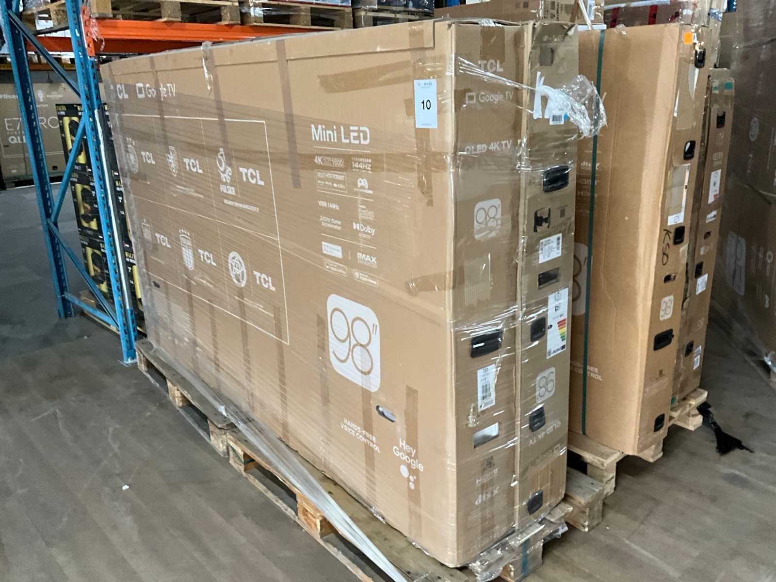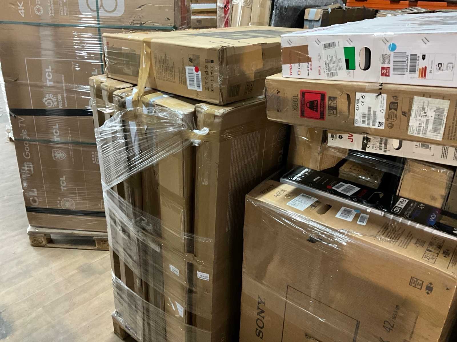 Bestaande uit 14x pallet (circa 17 pallet plaatsen), merken onder andere: Hisense, Sony, TCL, Toshiba, JVC, Philips, waaronder: “Sony” Bravia XR 85” X90L. Link Excel lijst: https://1drv.ms/x/c/6D813F0F04EA5786/EW1MfTfmV3FGv6i6aLAYq30BZo0Nl7VBkXMRJBQztS-KGw?e=T5qwZk