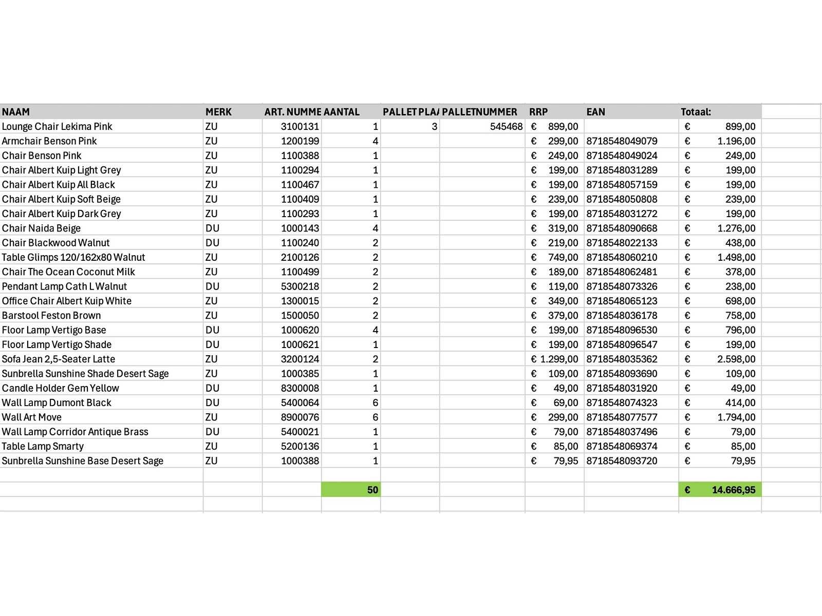 Bestaande uit merken: Zuiver, Dutchbone. Op 1x XL pallet, transport afmeting circa: 2300x1200x1900 mm, betreft A-grade retour producten.