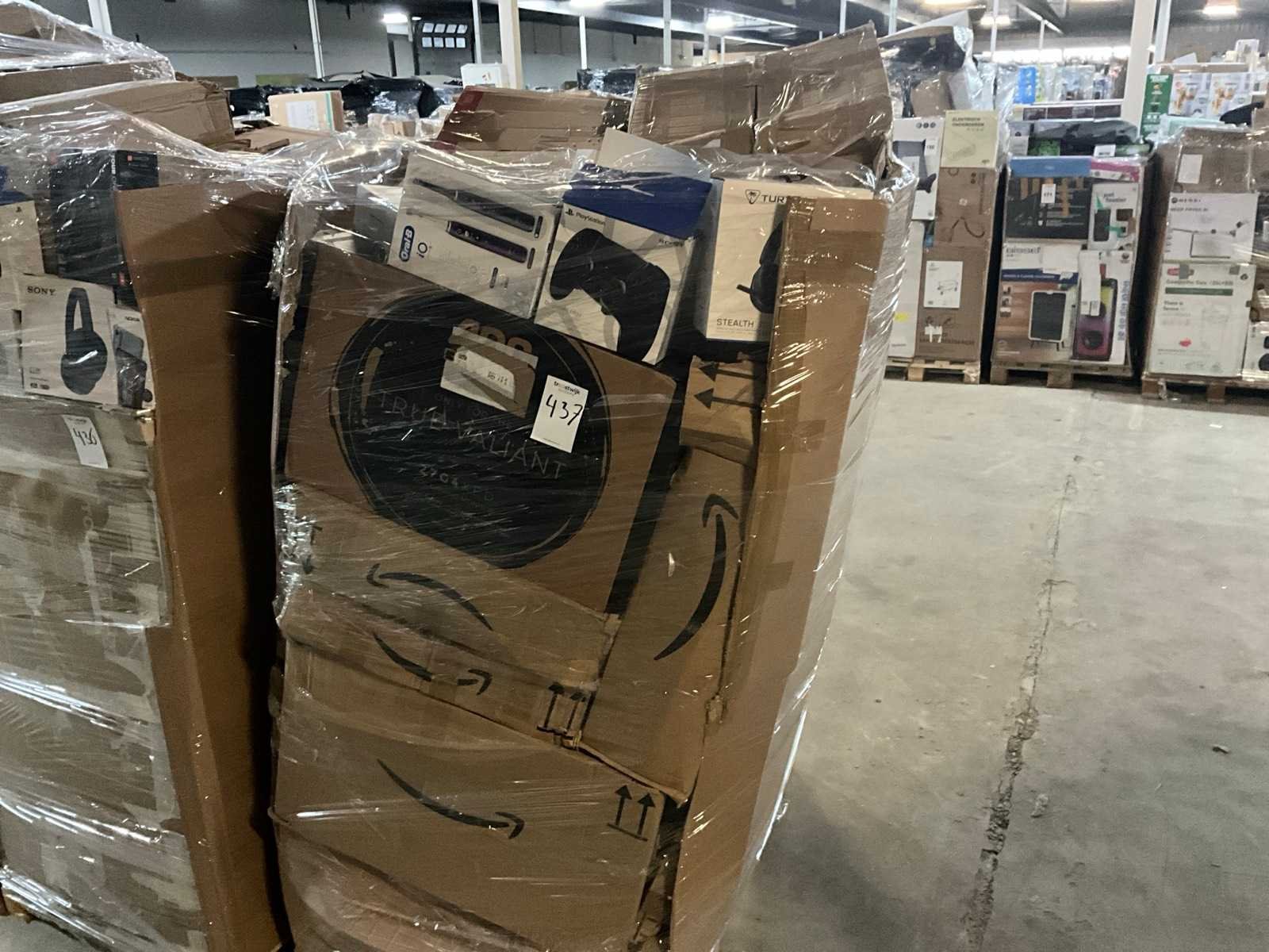 Bestaande uit 1x europallet met diverse Amazon retourgoed, circa 1.8 m hoog gestapeld.