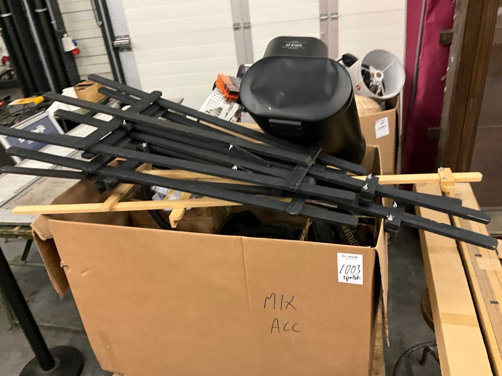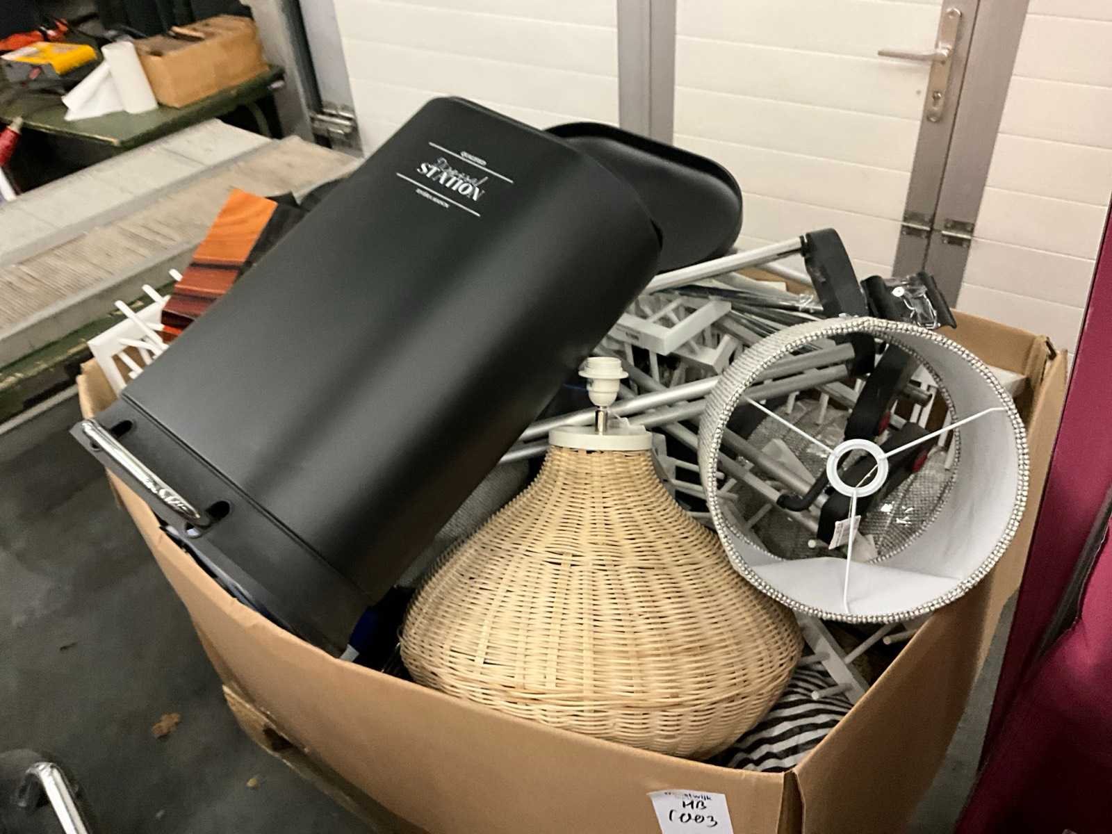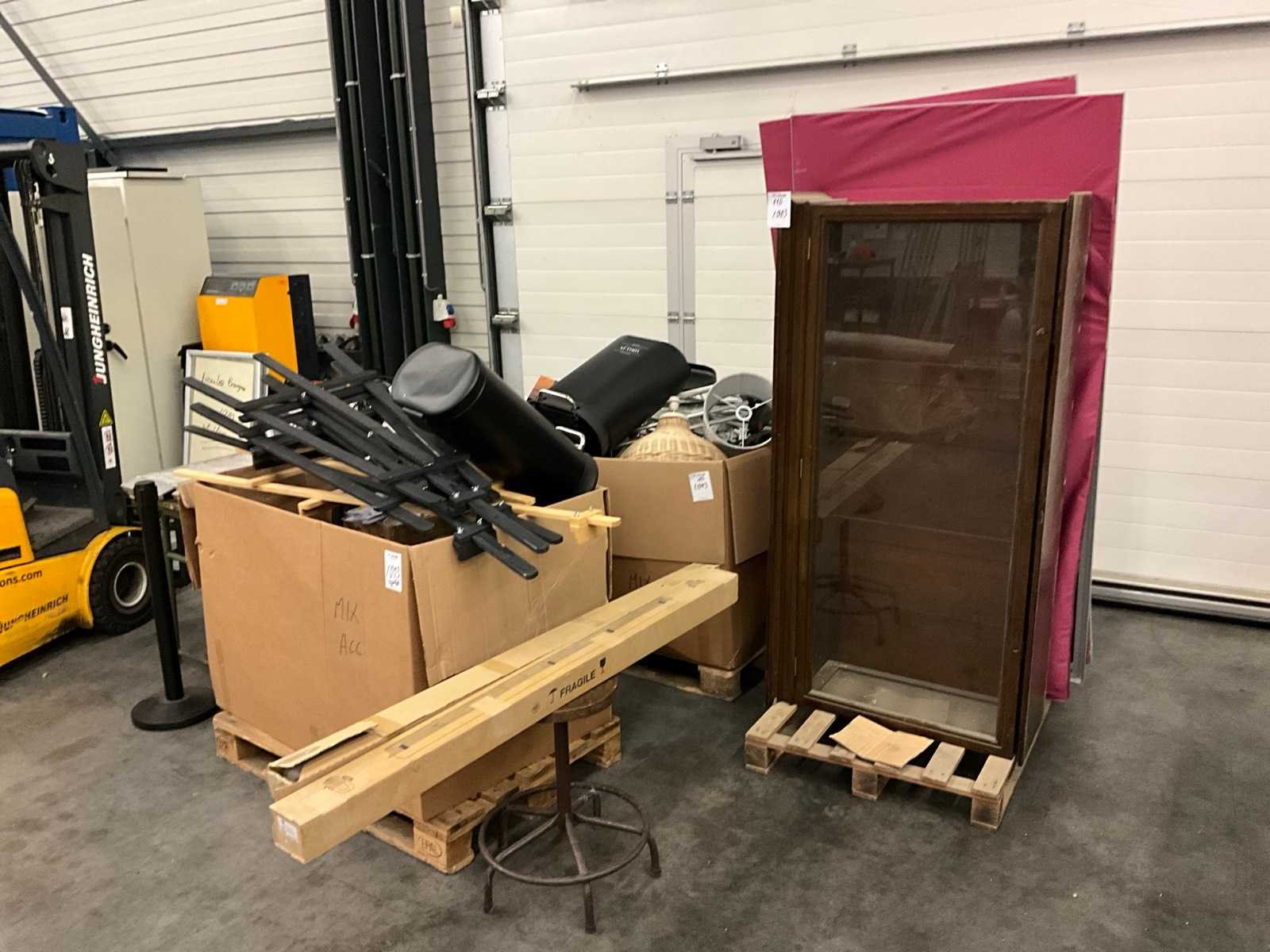 Bestaande uit 4x schilder ezel, diverse verlichting, 2x prullenbak, kast, kapstokken