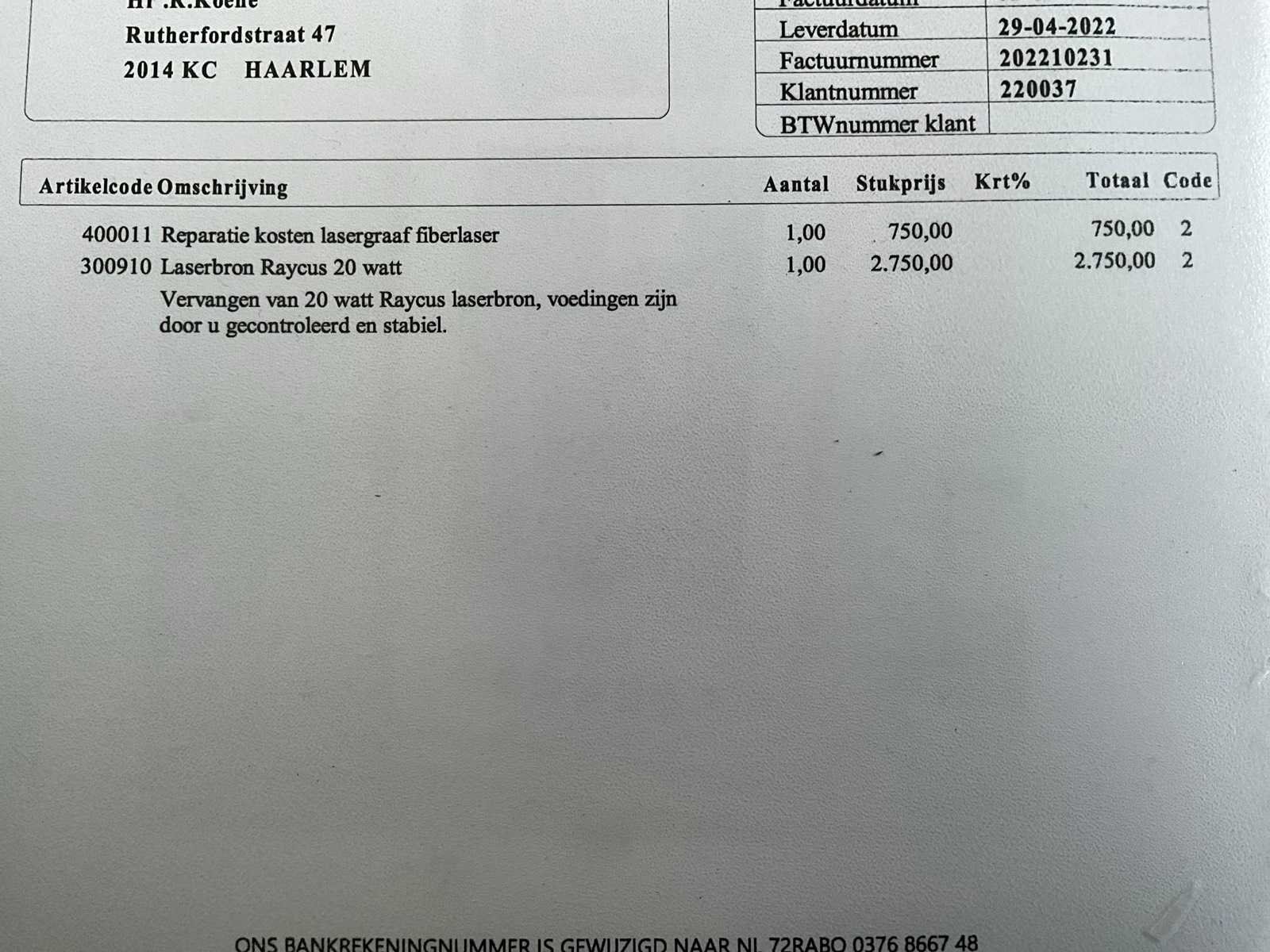 Inclusief Windows 7 laptop met bijbehorende EZCad 2.14.8 software; software is gekoppeld aan de lasermachine; volledige papieren documentatie; working area: 110x110mm; voorzien van Lasergraaf PA 300TS rookafzuiger Merk: Lasergraaf Type: XTL-FP20 Bouwjaar: 2017 Serienummer: 2017110014-2 Eigen gewicht: 40kg Totale afmeting L: 750mm Totale afmeting Breedte: 500mm Totale afmeting Hoogte: 1000mm