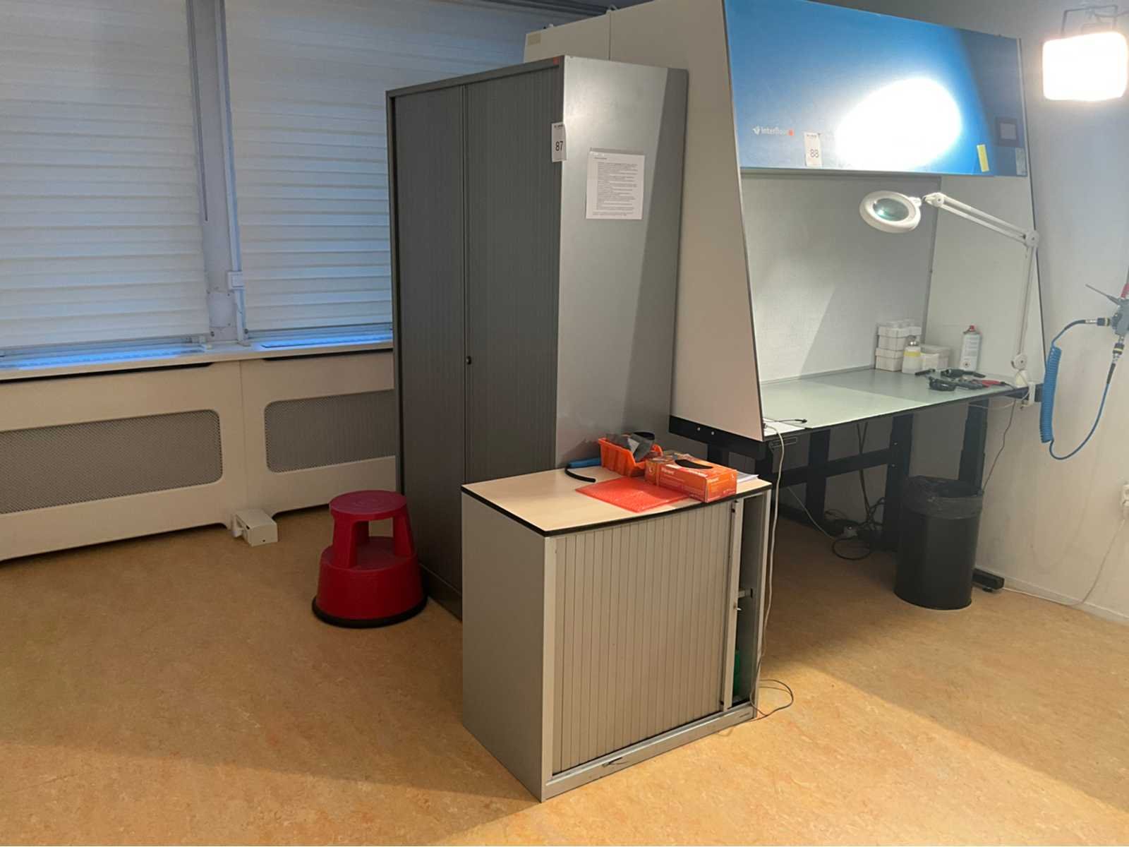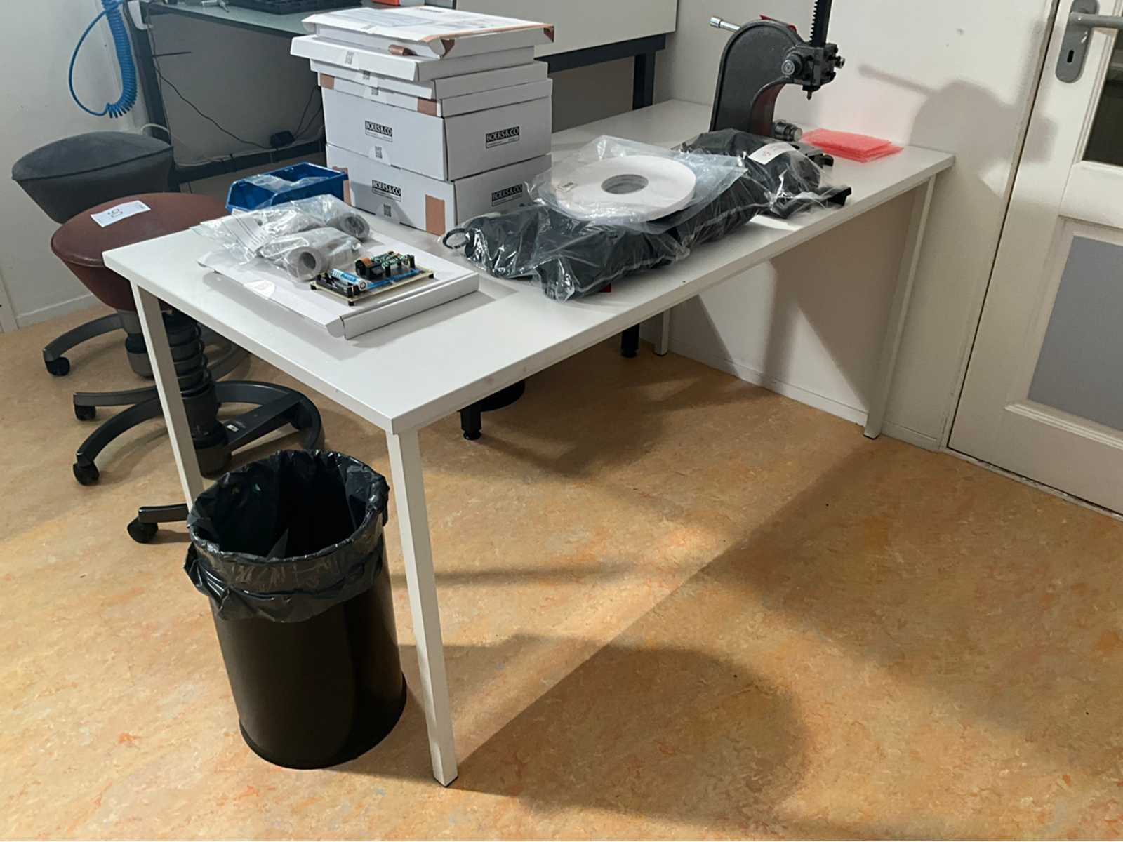 Bestaande uit 2x roldeurkast, afmeting: H195xB120xD45cm, H75xB80xD45cm en 1x werktafel, H76xB80xL160cm; Zonder inhoud kasten en spullen op tafel