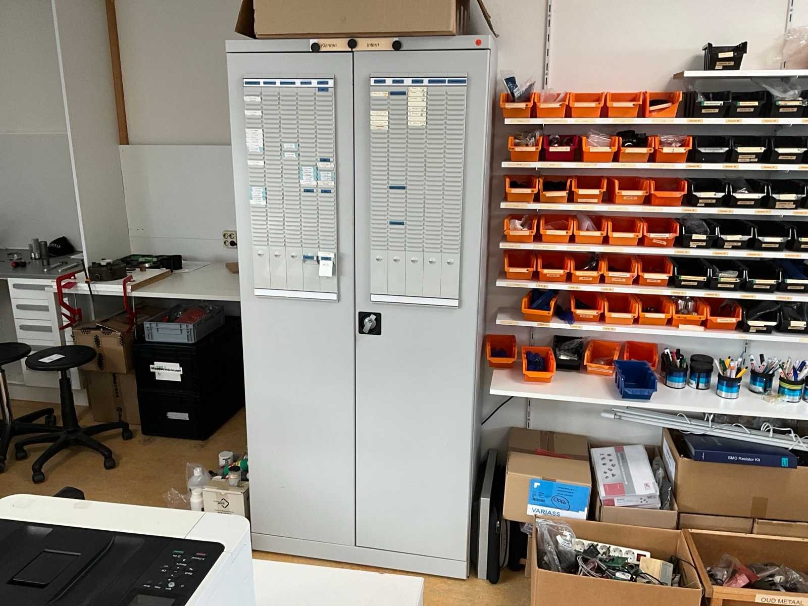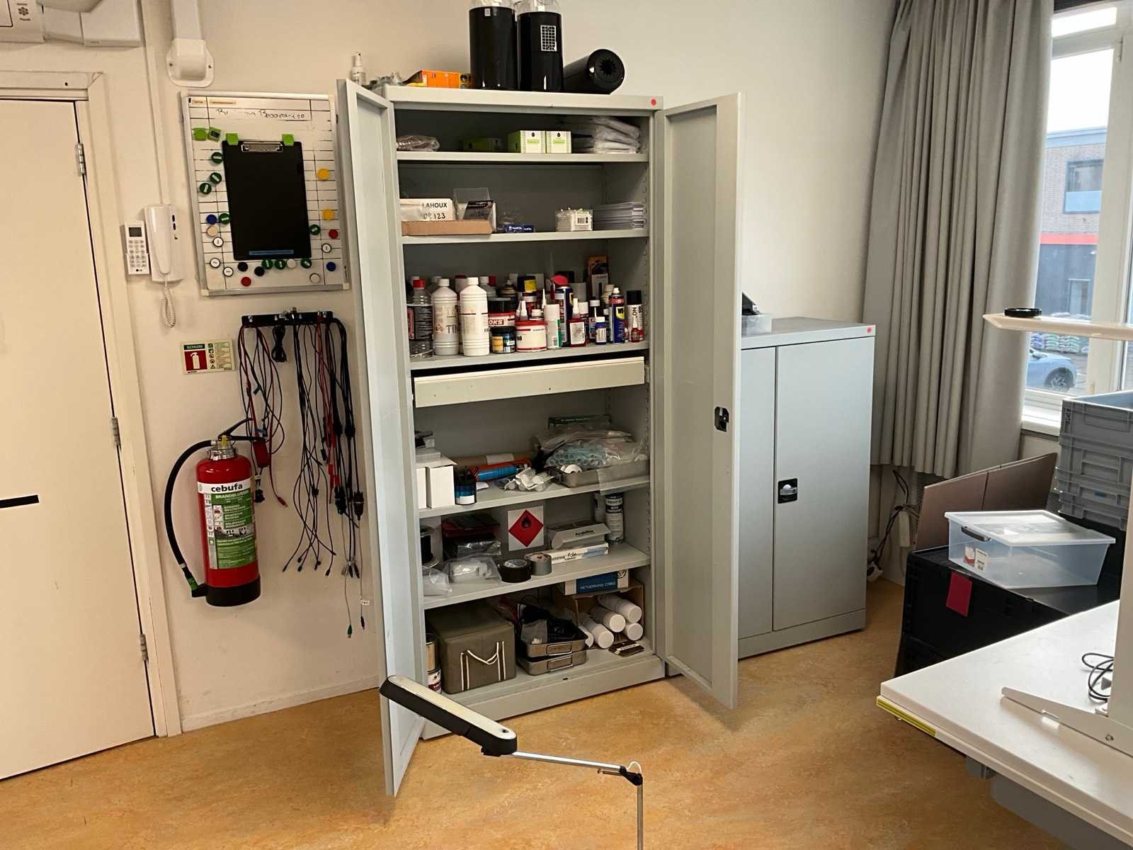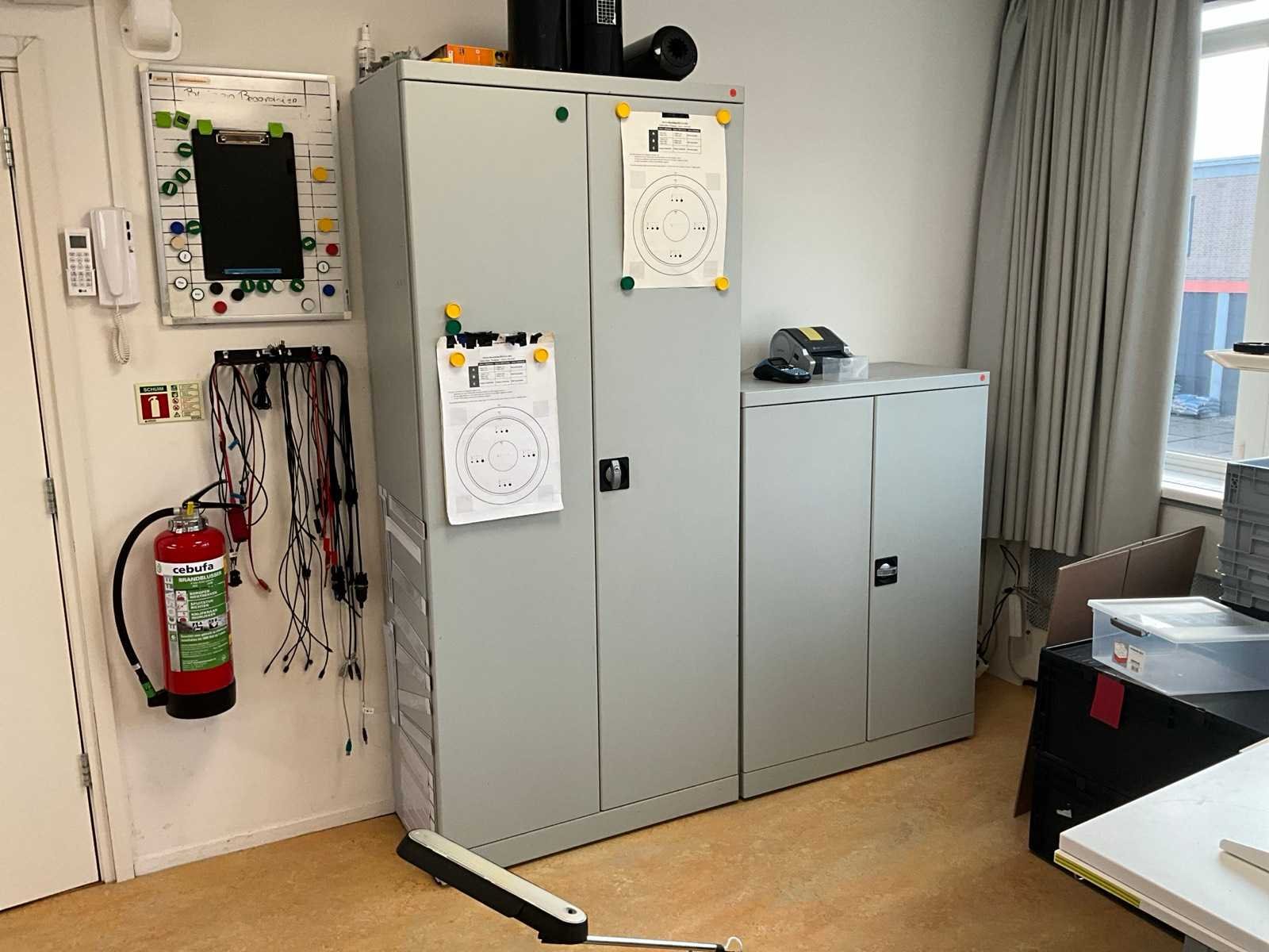Afmetingen: 3x H198xB88xD43cm, 1x H120xB90xD44cm; voorzien van diverse legborden; Zonder inhoud Materiaal: Metaal