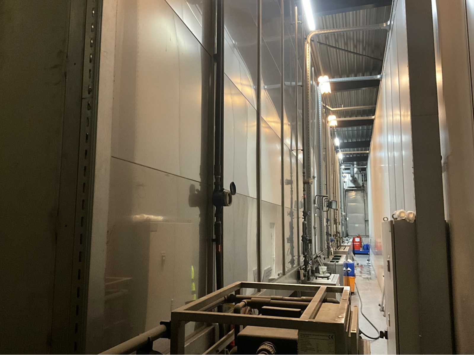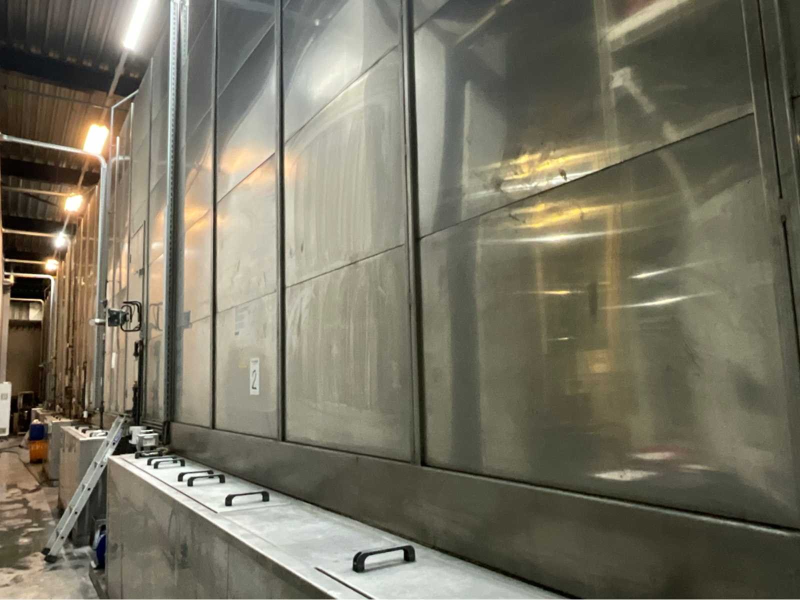 Voorbehandelingsinstallatie bestaande uit: 5 baden met: (zone 1) Ontvettingslijn, RVS304, 65°C, 510kW, Lengte: 10500mm (2+3) naspoeling van ontvetter, RVS 304, Lengte: 2900mm, Afspoeling demiwater, (4) Bondelite NT RVS 316, Lengte: 2900mm, (5) demiwater naspoeling, RVS 304, Lengte: 1250mm, ; inclusief: (2x) kunststof sub-tank. Tunnellengte: 32.440/5640mm, Totale lengte: 33.400/5840mm, breedte baden: 1640mm, Breedte tunnel: 1140mm, Transportsnelheid: 2.5 meter per minuut, Verwarmingsmedium: Heet water tot 90°C. Inclusief: omgekeerde osmose installatie met schakelkast, (1x) Viessmann ketel, type: Vitoplex 200, 609kW, met bordes. Merk: Emotech Bouwjaar: 2011 Motorvermogen (kW): 60kW Aansluiting: 400V Afmeting l: 33400mm
