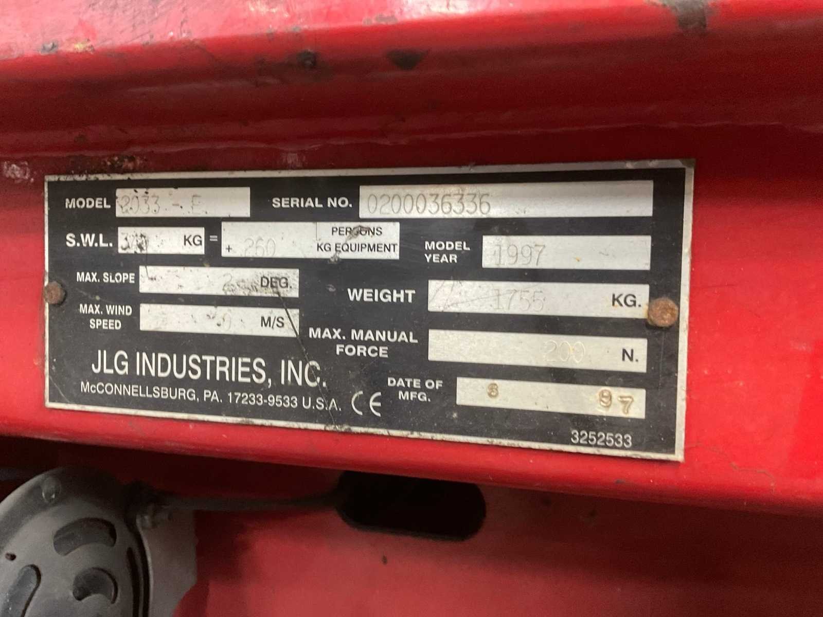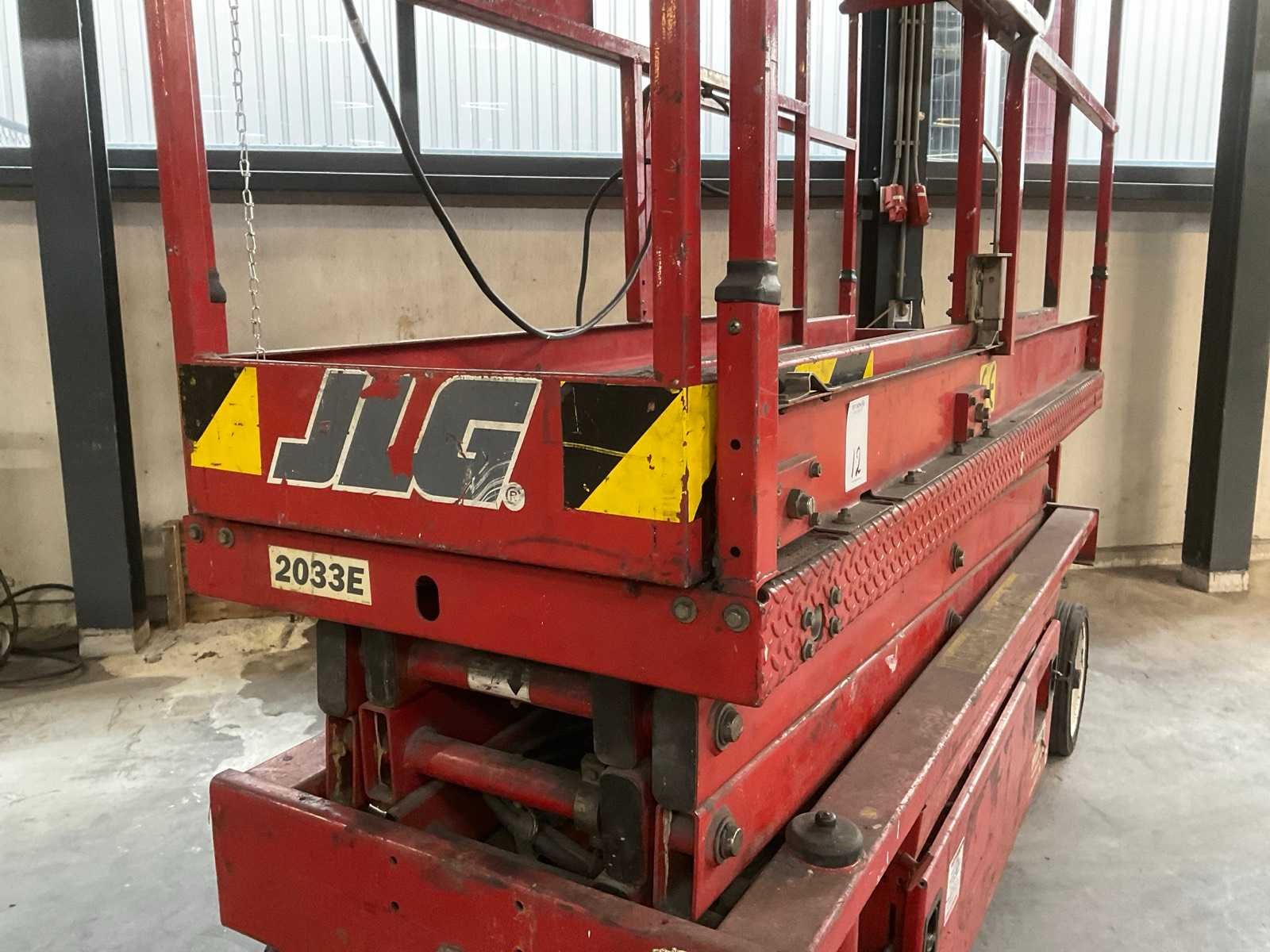 Merk: JLG Type: 2033E Bouwjaar: 1997 Serienummer: 0200036336 Schaarhoogwerker: true Werkhoogte: 8100mm Horizontale rijkwijdte: 2480mm Plateau afm. l: 2390mm Plateau afm. b: 750mm Platform capaciteit: 340kg Eigen gewicht: 1755kg Totale afmeting L: 2420mm Totale afmeting Breedte: 80mm Totale afmeting Hoogte: 2100mm