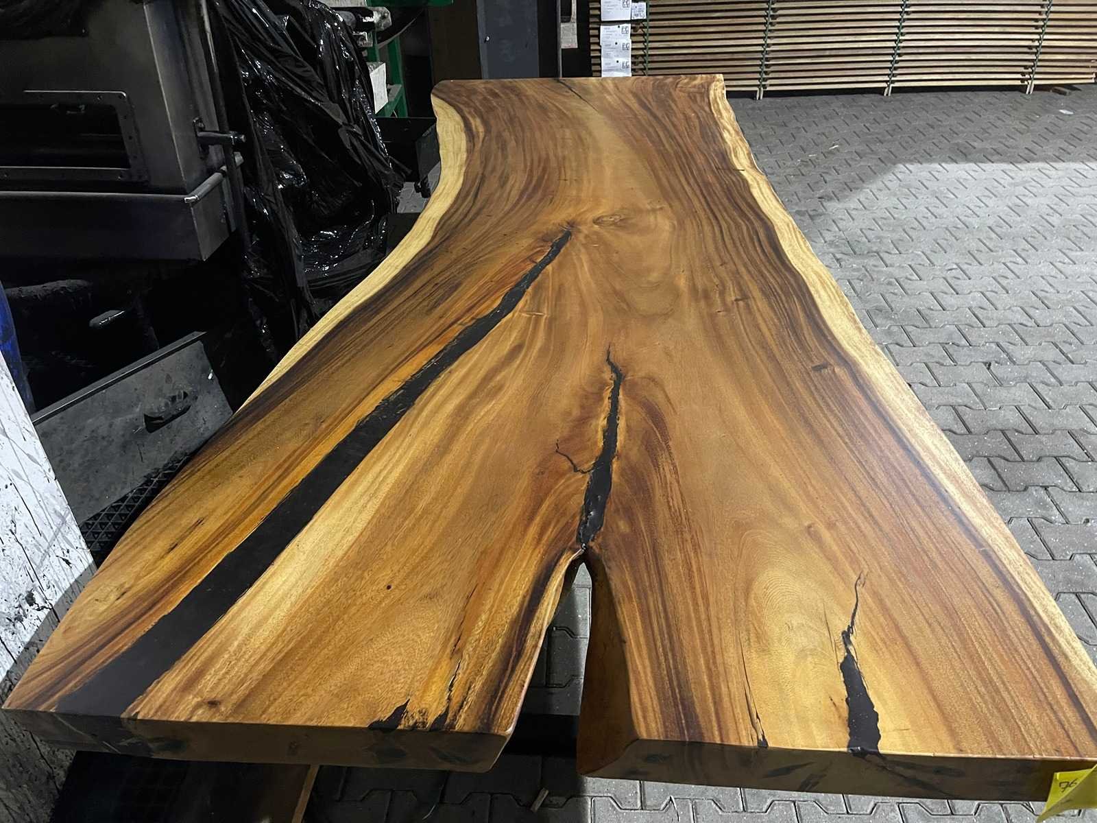 Wordt aangeboden met poten. Geschuurd en geolied. Let op, breedte is de gemiddelde breedte. Lengte: 325cm Breedte: 120cm Hoogte: 9cm Materiaal: Suar