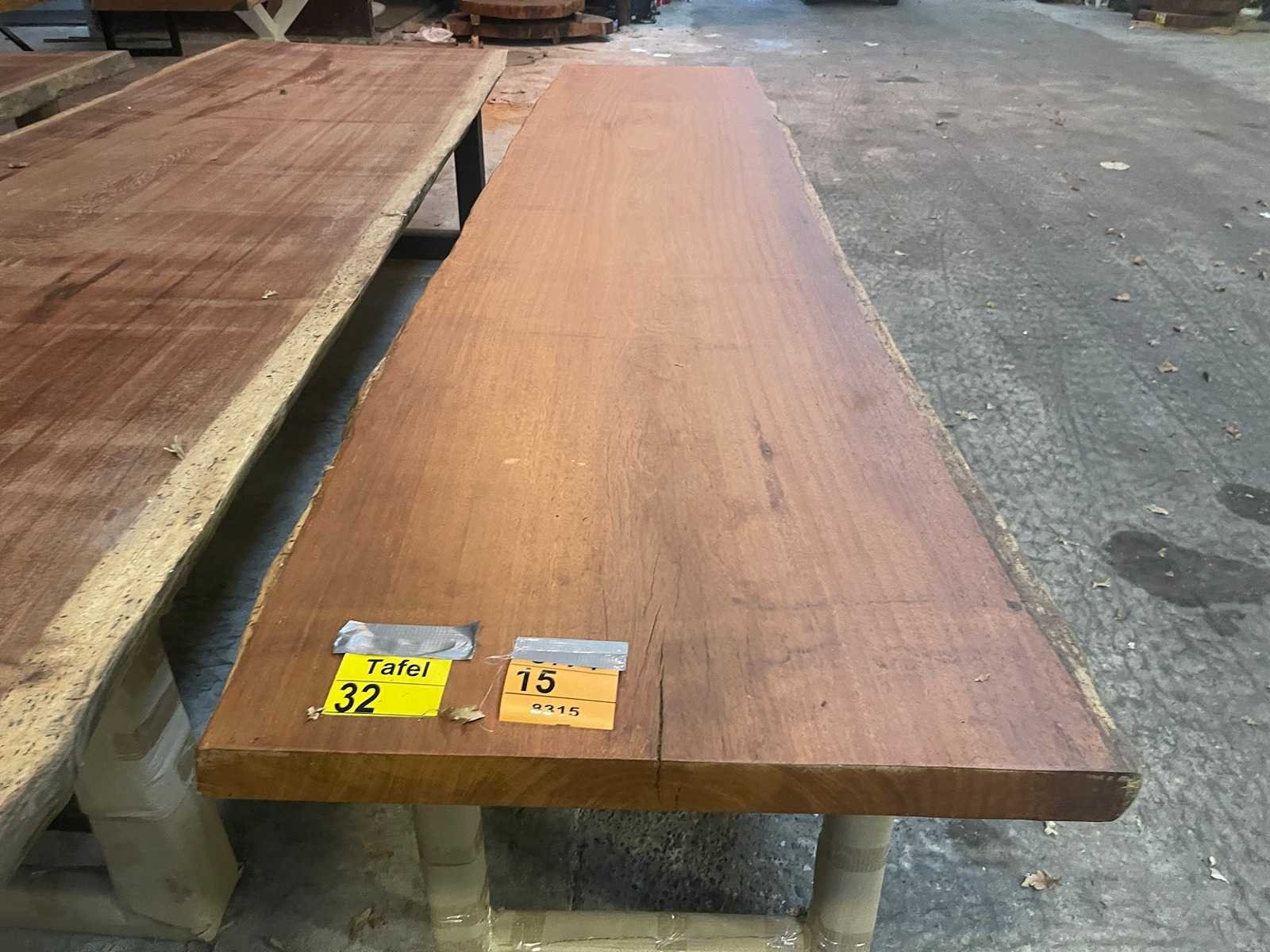 Wordt aangeboden met poten. Geschuurd en geolied. Let op, breedte is de gemiddelde breedte. Lengte: 350cm Breedte: 80cm Hoogte: 7cm Materiaal: Angelim Pedra/Makka Kabbes