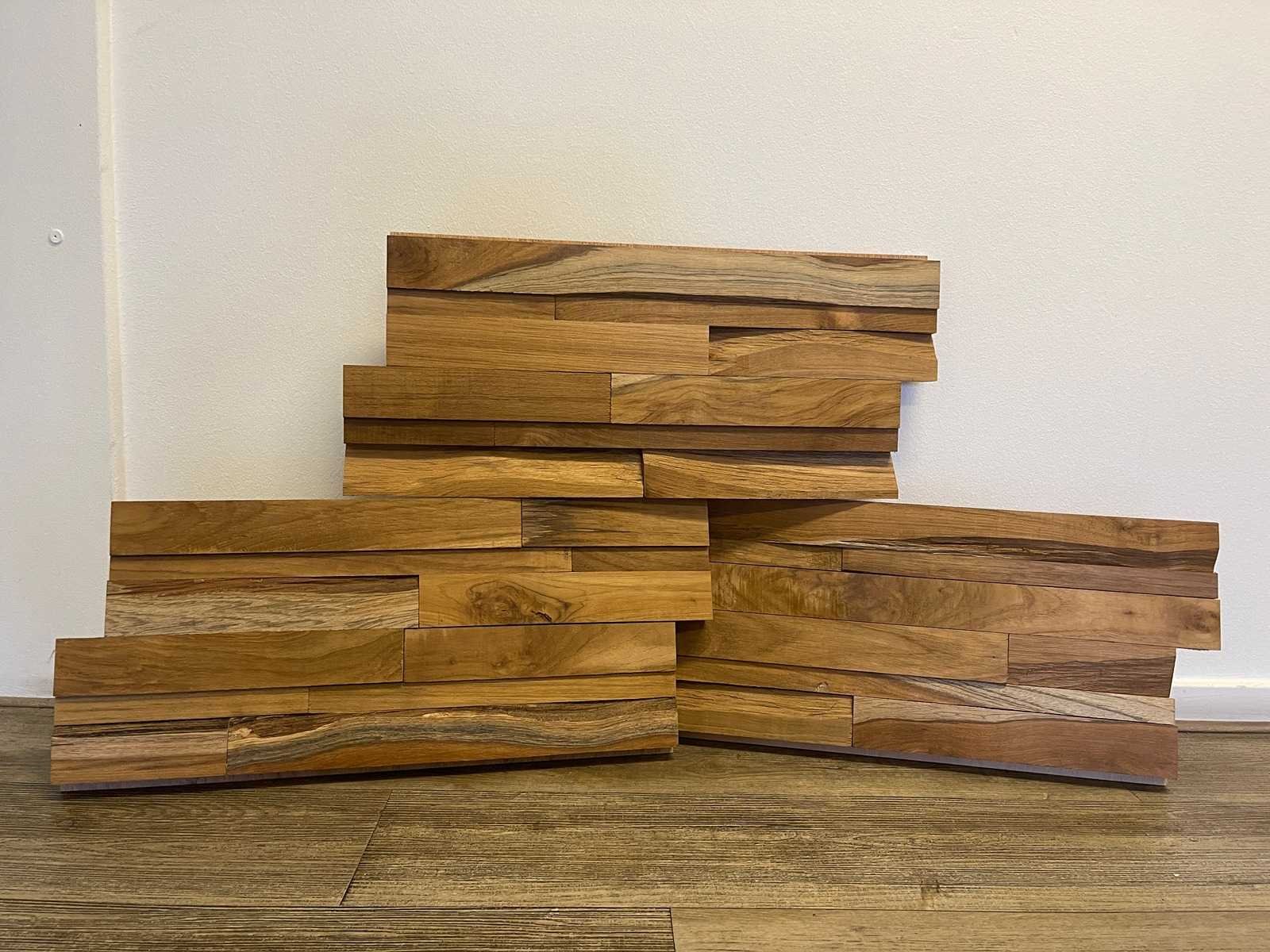 Afmeting per wandpaneel: 600x250x10-20mm. Let op: de laatste foto toont een voorbeeld van de houten wandbekleding
