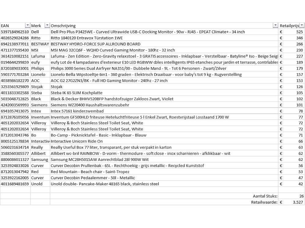 Dit betreft een partij A-merk retourgoederen van een grote online retailer. De partij bestaat uit diverse productcategorieën. Aantal stuks: 26. Retailwaarde: €3527,- Ongecontroleerd: werking onbekend (mix van werkend, incompleet, beschadigd, te gebruiken voor onderdelen). Kom op de kijkdag om te om zo een goed beeld te krijgen van de reden van retour. Zie foto's voor lijst met inhoud. Bezorgtermijn 14 dagen Merk: Pallet Retourgoederen