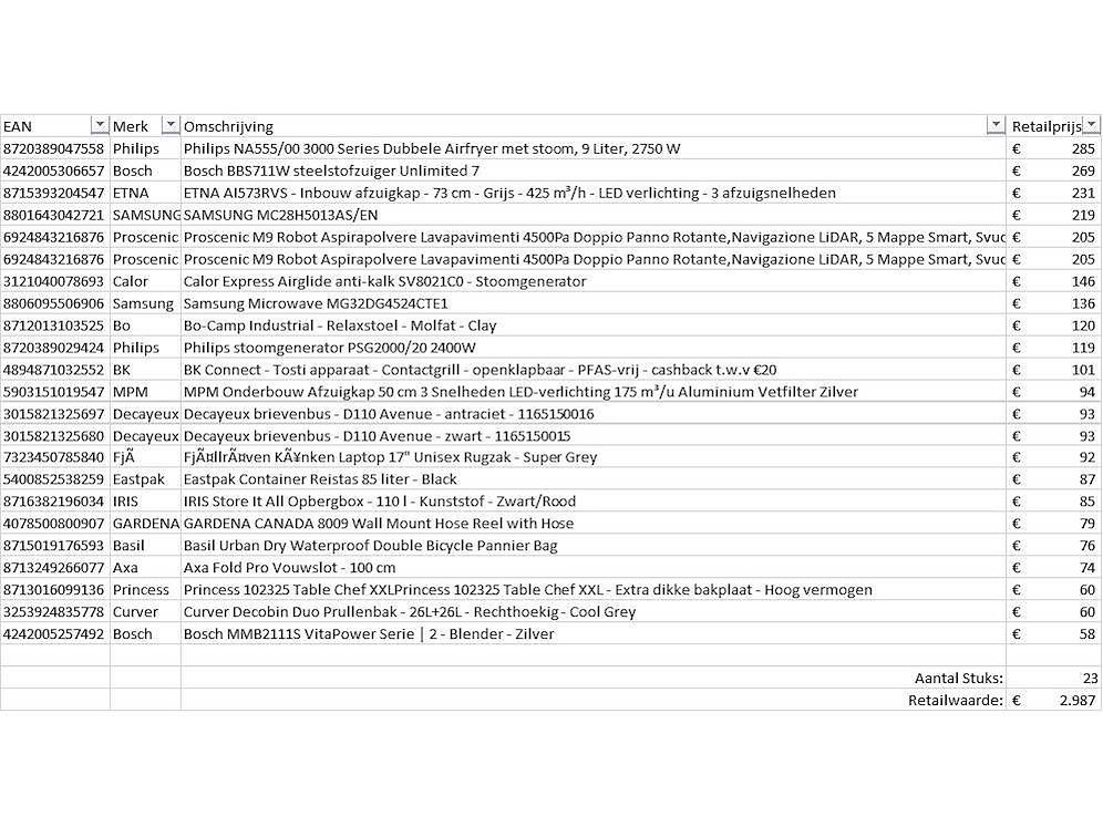 Dit betreft een partij A-merk retourgoederen van een grote online retailer. De partij bestaat uit diverse productcategorieën. Aantal stuks: 23. Retailwaarde: €2987,- Ongecontroleerd: werking onbekend (mix van werkend, incompleet, beschadigd, te gebruiken voor onderdelen). Kom op de kijkdag om te om zo een goed beeld te krijgen van de reden van retour. Zie foto's voor lijst met inhoud. Bezorgtermijn 14 dagen Merk: Pallet Retourgoederen