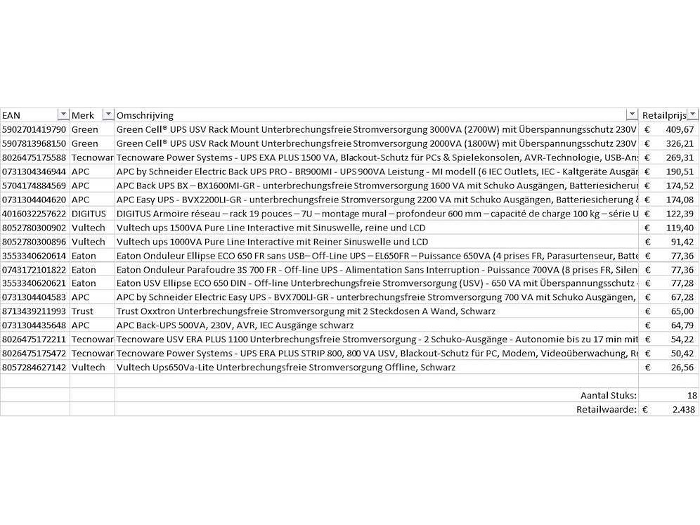 Dit betreft een partij noodstroomvoorzieningen van een grote online retailer. De partij bestaat uit diverse soorten noodstroom voorzieningen waaronder back ups, power stations etc. Aantal stuks: 18. Retailwaarde: €2438,- Ongecontroleerd: werking onbekend (mix van werkend, incompleet, beschadigd, te gebruiken voor onderdelen). Kom op de kijkdag om te om zo een goed beeld te krijgen van de reden van retour. Zie foto's voor lijst met inhoud. Bezorgtermijn 14 dagen Merk: Pallet Retourgoederen - Noodstroom voorzieningen