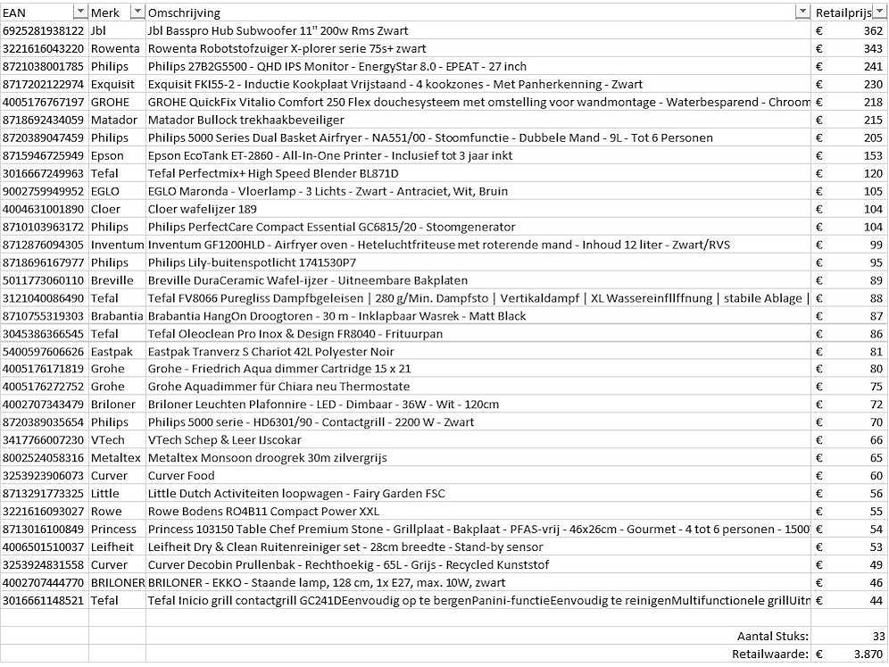 Dit betreft een partij A-merk retourgoederen van een grote online retailer. De partij bestaat uit diverse productcategorieën. Aantal stuks: 33. Retailwaarde: €3870,- Ongecontroleerd: werking onbekend (mix van werkend, incompleet, beschadigd, te gebruiken voor onderdelen). Kom op de kijkdag om te om zo een goed beeld te krijgen van de reden van retour. Zie foto's voor lijst met inhoud. Bezorgtermijn 14 dagen Merk: Pallet Retourgoederen