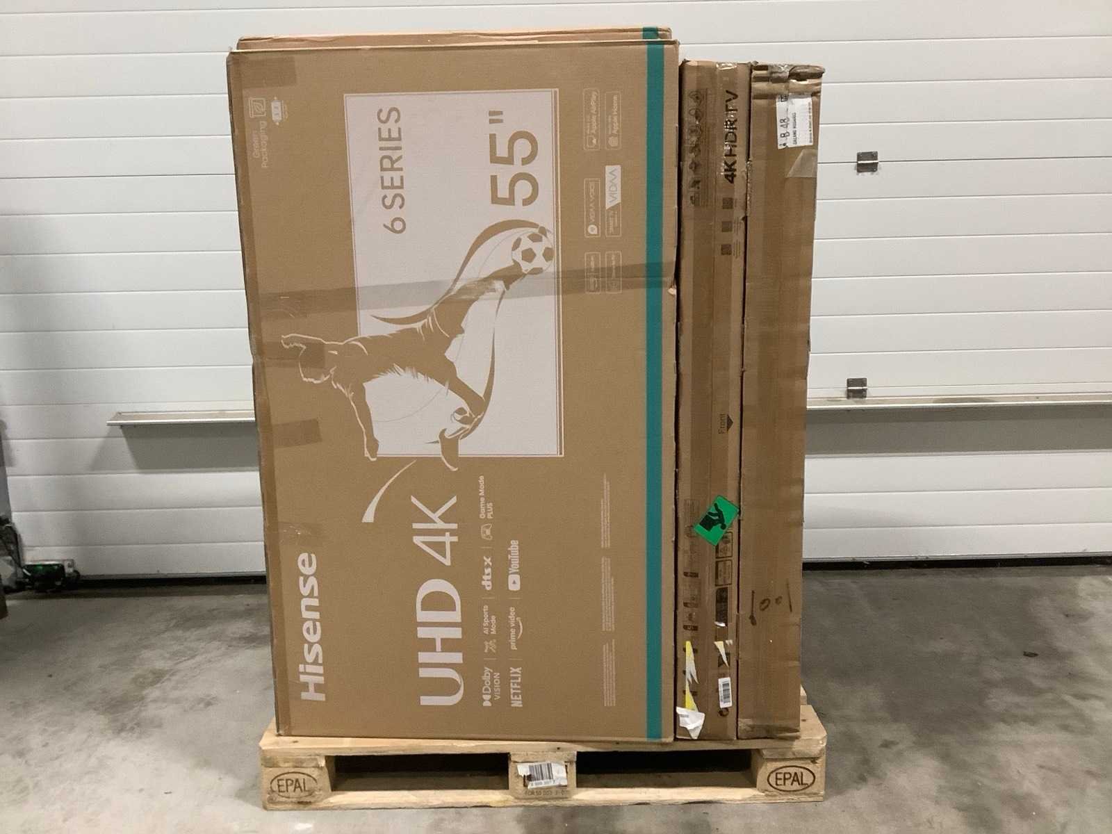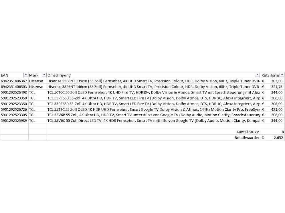 Dit betreft een partij televisies retourgoederen van een grote online retailer. De partij bestaat uit diverse diverse maten televisies. Aantal stuks: 8. Retailwaarde: €2652,- De televisies zijn niet werkend en zijn te gebruiken voor onderdelen. Kom op de kijkdag om te om zo een goed beeld te krijgen van de reden van retour. Zie foto's voor lijst met inhoud. Bezorgtermijn 14 dagen Merk: Pallet Retourgoederen - Televisies