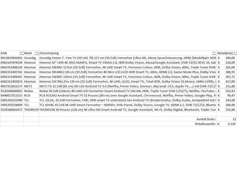 Dit betreft een partij televisies retourgoederen van een grote online retailer. De partij bestaat uit diverse diverse maten televisies. Aantal stuks: 12. Retailwaarde: €3114,- De televisies zijn niet werkend en zijn te gebruiken voor onderdelen. Kom op de kijkdag om te om zo een goed beeld te krijgen van de reden van retour. Zie foto's voor lijst met inhoud. Bezorgtermijn 14 dagen Merk: Pallet Retourgoederen - Televisies