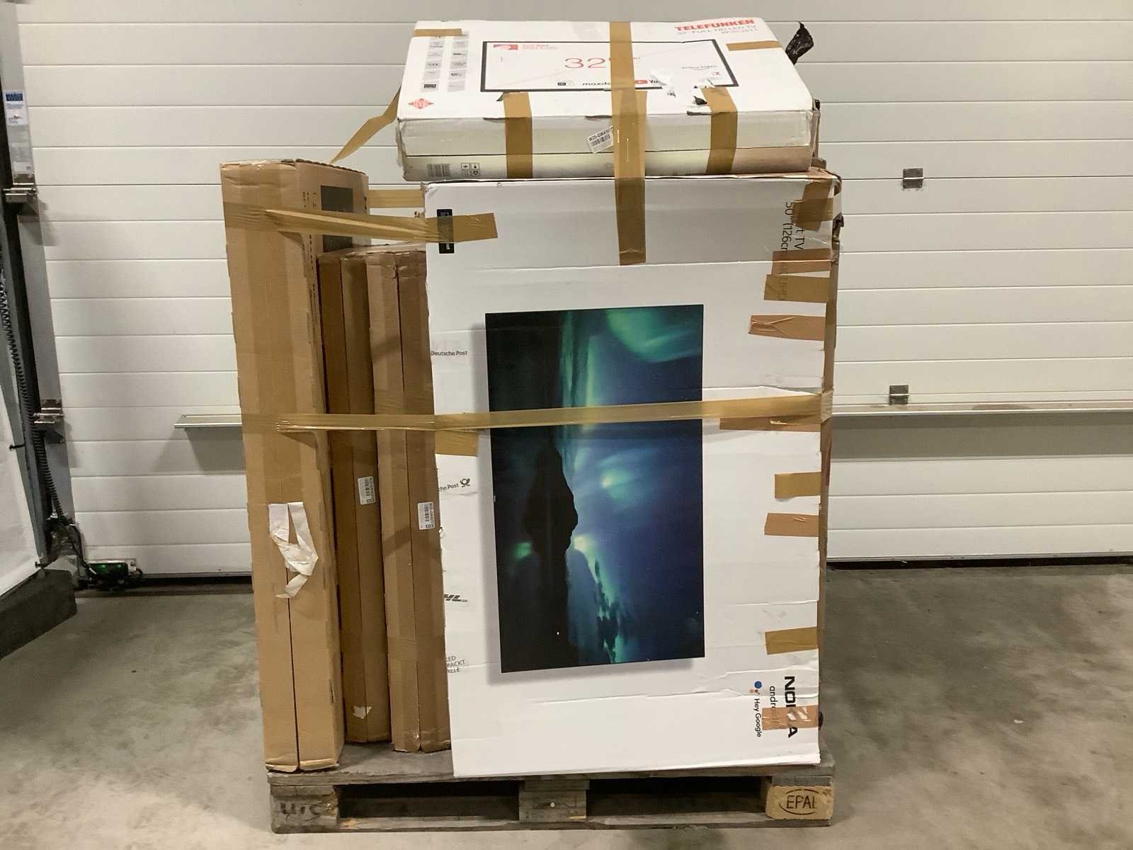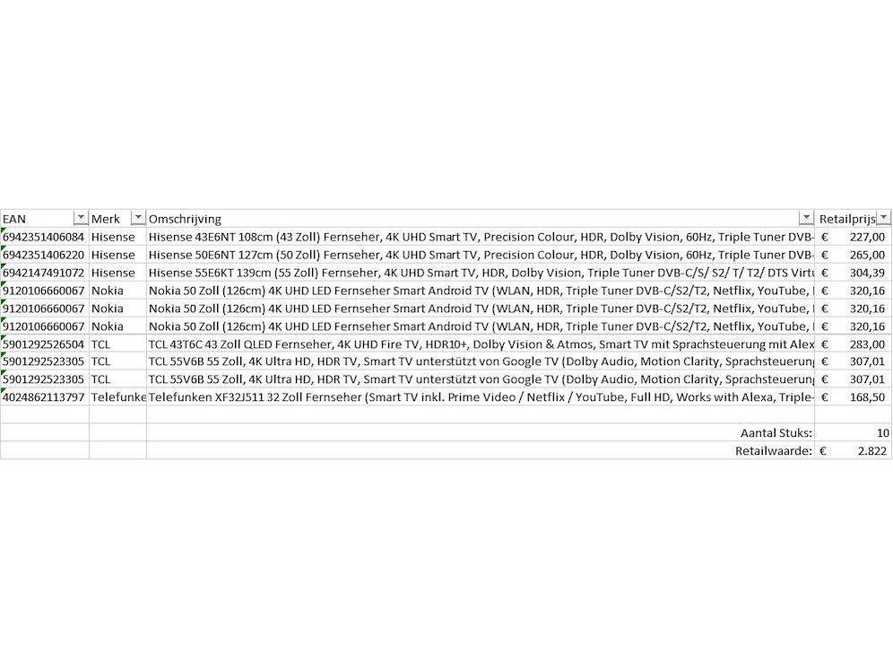 Dit betreft een partij televisies retourgoederen van een grote online retailer. De partij bestaat uit diverse diverse maten televisies. Aantal stuks: 10. Retailwaarde: €2822,- De televisies zijn niet werkend en zijn te gebruiken voor onderdelen. Kom op de kijkdag om te om zo een goed beeld te krijgen van de reden van retour. Zie foto's voor lijst met inhoud. Bezorgtermijn 14 dagen Merk: Pallet Retourgoederen - Televisies