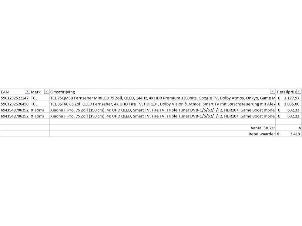 Dit betreft een partij televisies retourgoederen van een grote online retailer. De partij bestaat uit diverse diverse maten televisies. Aantal stuks: 4. Retailwaarde: €3418,- De televisies zijn niet werkend en zijn te gebruiken voor onderdelen. Kom op de kijkdag om te om zo een goed beeld te krijgen van de reden van retour. Zie foto's voor lijst met inhoud. Bezorgtermijn 14 dagen Merk: Pallet Retourgoederen - Televisies