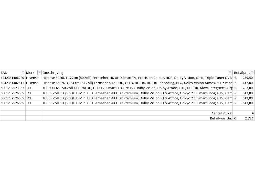 Dit betreft een partij televisies retourgoederen van een grote online retailer. De partij bestaat uit diverse diverse maten televisies. Aantal stuks: 6. Retailwaarde: €2799,- De televisies zijn niet werkend en zijn te gebruiken voor onderdelen. Kom op de kijkdag om te om zo een goed beeld te krijgen van de reden van retour. Zie foto's voor lijst met inhoud. Bezorgtermijn 14 dagen Merk: Pallet Retourgoederen - Televisies