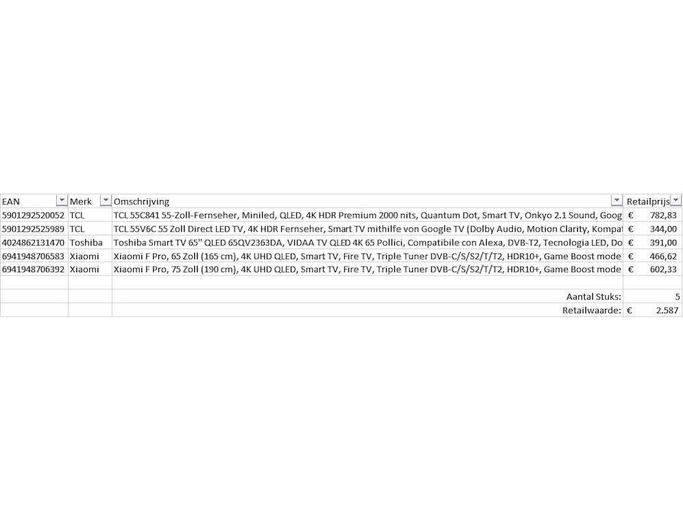 Dit betreft een partij televisies retourgoederen van een grote online retailer. De partij bestaat uit diverse diverse maten televisies. Aantal stuks: 5. Retailwaarde: €2587,- De televisies zijn niet werkend en zijn te gebruiken voor onderdelen. Kom op de kijkdag om te om zo een goed beeld te krijgen van de reden van retour. Zie foto's voor lijst met inhoud. Bezorgtermijn 14 dagen Merk: Pallet Retourgoederen - Televisies