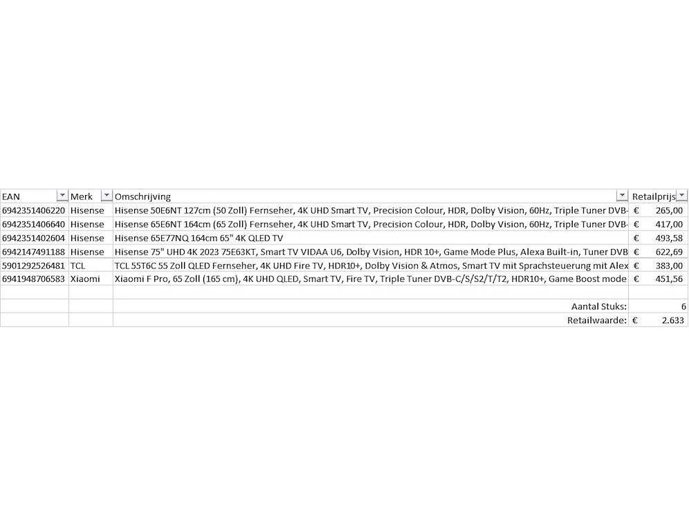Dit betreft een partij televisies retourgoederen van een grote online retailer. De partij bestaat uit diverse diverse maten televisies. Aantal stuks: 6. Retailwaarde: €2633,- De televisies zijn niet werkend en zijn te gebruiken voor onderdelen. Kom op de kijkdag om te om zo een goed beeld te krijgen van de reden van retour. Zie foto's voor lijst met inhoud. Bezorgtermijn 14 dagen Merk: Pallet Retourgoederen - Televisies