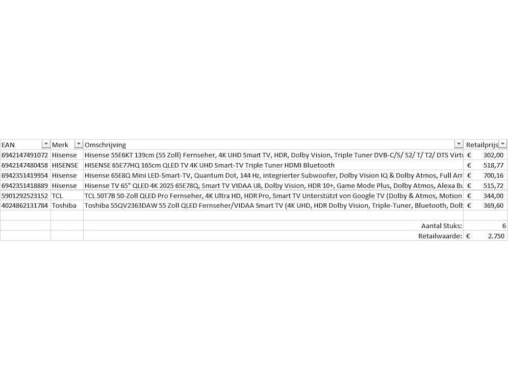Dit betreft een partij televisies retourgoederen van een grote online retailer. De partij bestaat uit diverse diverse maten televisies. Aantal stuks: 6. Retailwaarde: €2750,- De televisies zijn niet werkend en zijn te gebruiken voor onderdelen. Kom op de kijkdag om te om zo een goed beeld te krijgen van de reden van retour. Zie foto's voor lijst met inhoud. Bezorgtermijn 14 dagen Merk: Pallet Retourgoederen - Televisies