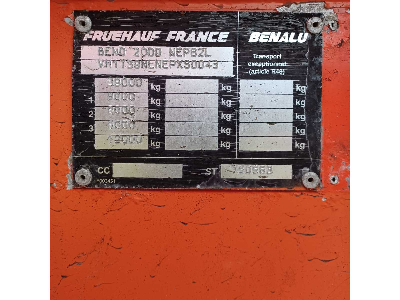 Opgelet: Nederlandse Boorddocumenten, Massa ledig voertuig: 6930kg, Max.Massa Voertuig: 39000kg, laadvermogen: 32070kg, 1ste toelating: 12/07/1999, APK vervaldatum: 13/03/2026 Merk: Benalu Type: T39NLNEP Bouwjaar: 1999 Chassisnummer VIN: VH1T39NLNEPXS0043 Kenteken: OF-85-ZX Datum eerste toelating (NL): 1999-07-12 Datum eerste toelating: 1999-07-12 APK vervaldatum: 2026-03-13 Aantal assen: 3 Laadvermogen: 32050kg Eigen gewicht: 6950kg