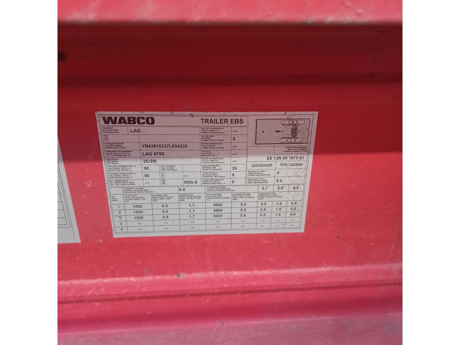 Opgelet: Nederlandse Boorddocumenten, Massa ledig voertuig: 7000kg, Max.Massa Voertuig: 40000kg, laadvermogen: 33000kg, 1ste toelating: 28/02/2008, APK vervaldatum: 04/06/2026 Merk: Lag Type: O-3-40-02 Bouwjaar: 2008 Chassisnummer VIN: YB43010238L034233 Kenteken: OK-41-DZ Datum eerste toelating (NL): 2008-02-28 Datum eerste toelating: 2008-02-28 APK vervaldatum: 2026-06-04 Aantal assen: 3 Laadvermogen: 33000kg