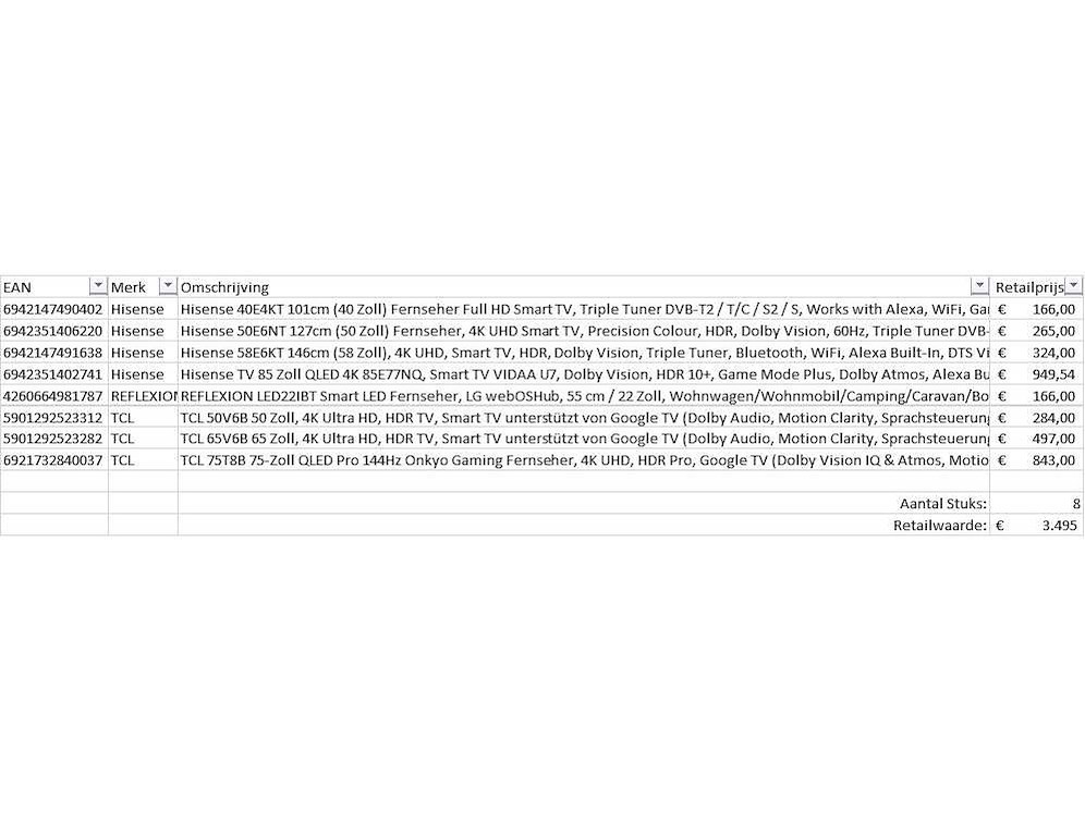 Dit betreft een partij televisies retourgoederen van een grote online retailer. De partij bestaat uit diverse diverse maten televisies. Aantal stuks: 8. Retailwaarde: €3495,- De televisies zijn niet werkend en zijn te gebruiken voor onderdelen. Kom op de kijkdag om te om zo een goed beeld te krijgen van de reden van retour. Zie foto's voor lijst met inhoud. Bezorgtermijn 14 dagen Merk: Pallet Retourgoederen - Televisies