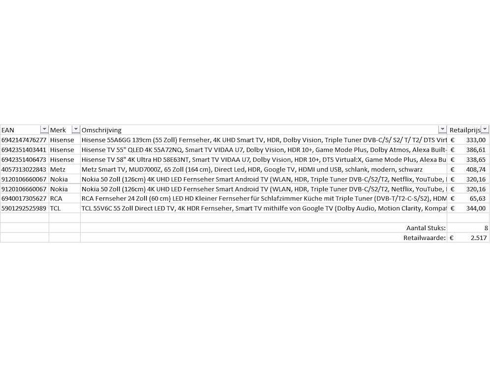 Dit betreft een partij televisies retourgoederen van een grote online retailer. De partij bestaat uit diverse diverse maten televisies. Aantal stuks: 8. Retailwaarde: €2517,- De televisies zijn niet werkend en zijn te gebruiken voor onderdelen. Kom op de kijkdag om te om zo een goed beeld te krijgen van de reden van retour. Zie foto's voor lijst met inhoud. Bezorgtermijn 14 dagen Merk: Pallet Retourgoederen - Televisies