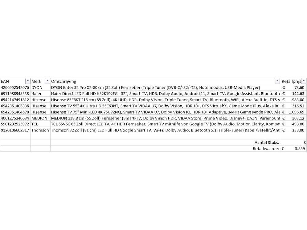 Dit betreft een partij televisies retourgoederen van een grote online retailer. De partij bestaat uit diverse diverse maten televisies. Aantal stuks: 8. Retailwaarde: €3559,- De televisies zijn niet werkend en zijn te gebruiken voor onderdelen. Kom op de kijkdag om te om zo een goed beeld te krijgen van de reden van retour. Zie foto's voor lijst met inhoud. Bezorgtermijn 14 dagen Merk: Pallet Retourgoederen - Televisies