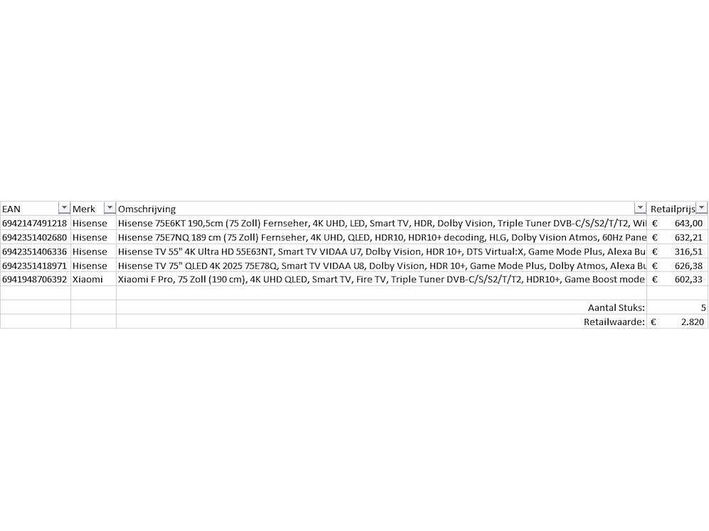 Dit betreft een partij televisies retourgoederen van een grote online retailer. De partij bestaat uit diverse diverse maten televisies. Aantal stuks: 5. Retailwaarde: €2820,- De televisies zijn niet werkend en zijn te gebruiken voor onderdelen. Kom op de kijkdag om te om zo een goed beeld te krijgen van de reden van retour. Zie foto's voor lijst met inhoud. Bezorgtermijn 14 dagen Merk: Pallet Retourgoederen - Televisies