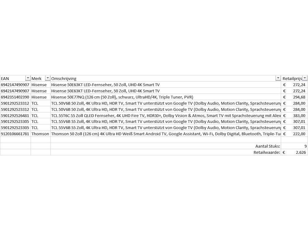 Dit betreft een partij televisies retourgoederen van een grote online retailer. De partij bestaat uit diverse diverse maten televisies. Aantal stuks: 9. Retailwaarde: €2626,- De televisies zijn niet werkend en zijn te gebruiken voor onderdelen. Kom op de kijkdag om te om zo een goed beeld te krijgen van de reden van retour. Zie foto's voor lijst met inhoud. Bezorgtermijn 14 dagen Merk: Pallet Retourgoederen - Televisies