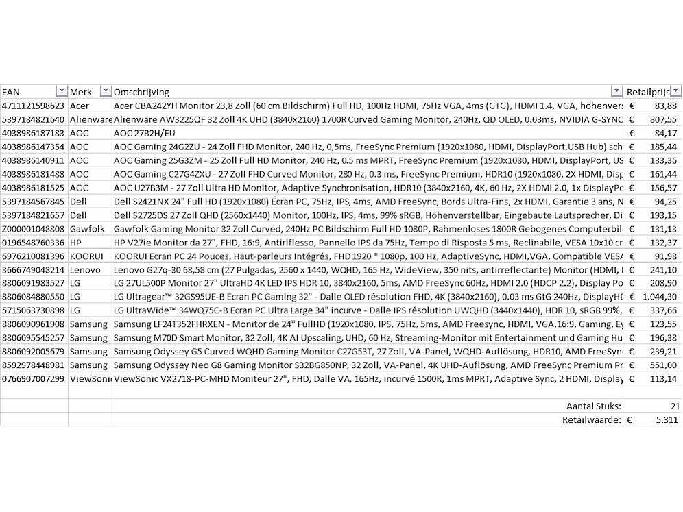 Dit betreft een partij PC Schermen / Monitors retourgoederen van een grote online retailer. De partij bestaat uit diverse diverse maten PC Schermen / Monitors. Aantal stuks: 21. Retailwaarde: €5311,- De PC chermen / Monitors zijn niet werkend en zijn te gebruiken voor onderdelen. Kom op de kijkdag om te om zo een goed beeld te krijgen van de reden van retour. Zie foto's voor lijst met inhoud. Bezorgtermijn 14 dagen Merk: Pallet Retourgoederen - PC / Monitors