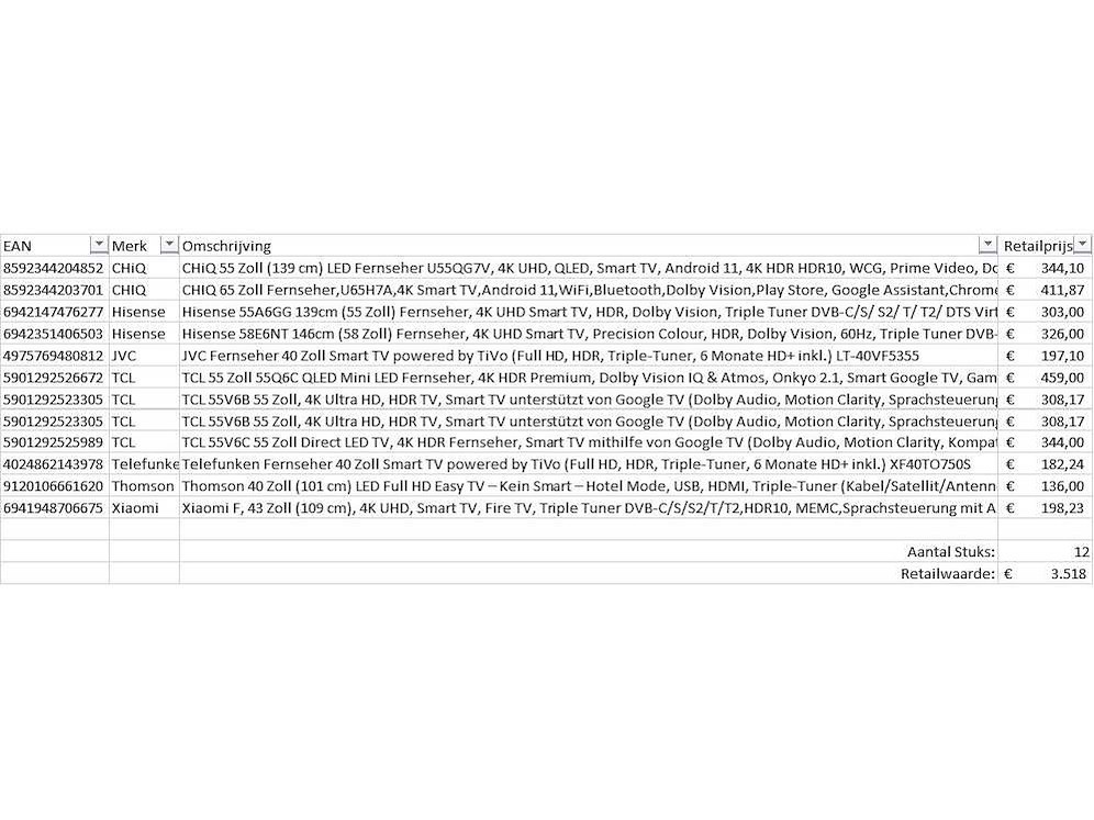 Dit betreft een partij televisies retourgoederen van een grote online retailer. De partij bestaat uit diverse diverse maten televisies. Aantal stuks: 12. Retailwaarde: €3518,- De televisies zijn niet werkend en zijn te gebruiken voor onderdelen. Kom op de kijkdag om te om zo een goed beeld te krijgen van de reden van retour. Zie foto's voor lijst met inhoud. Bezorgtermijn 14 dagen Merk: Pallet Retourgoederen - Televisies