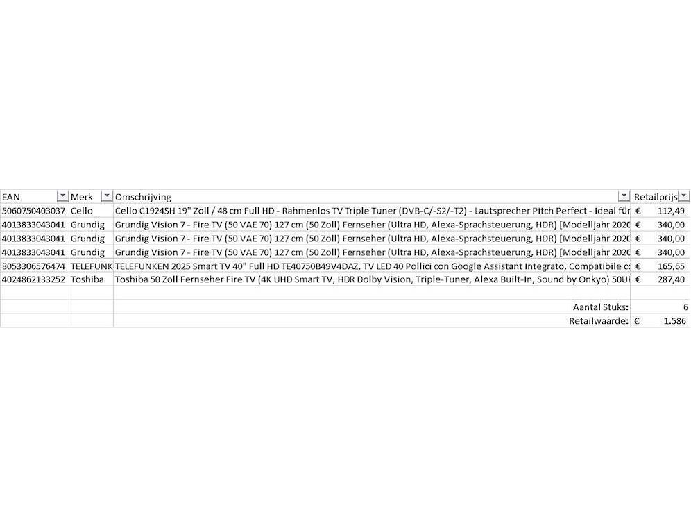 Dit betreft een partij televisies retourgoederen van een grote online retailer. De partij bestaat uit diverse diverse maten televisies. Aantal stuks: 6. Retailwaarde: €1586,- De televisies zijn niet werkend en zijn te gebruiken voor onderdelen. Kom op de kijkdag om te om zo een goed beeld te krijgen van de reden van retour. Zie foto's voor lijst met inhoud. Bezorgtermijn 14 dagen Merk: Pallet Retourgoederen - Televisies