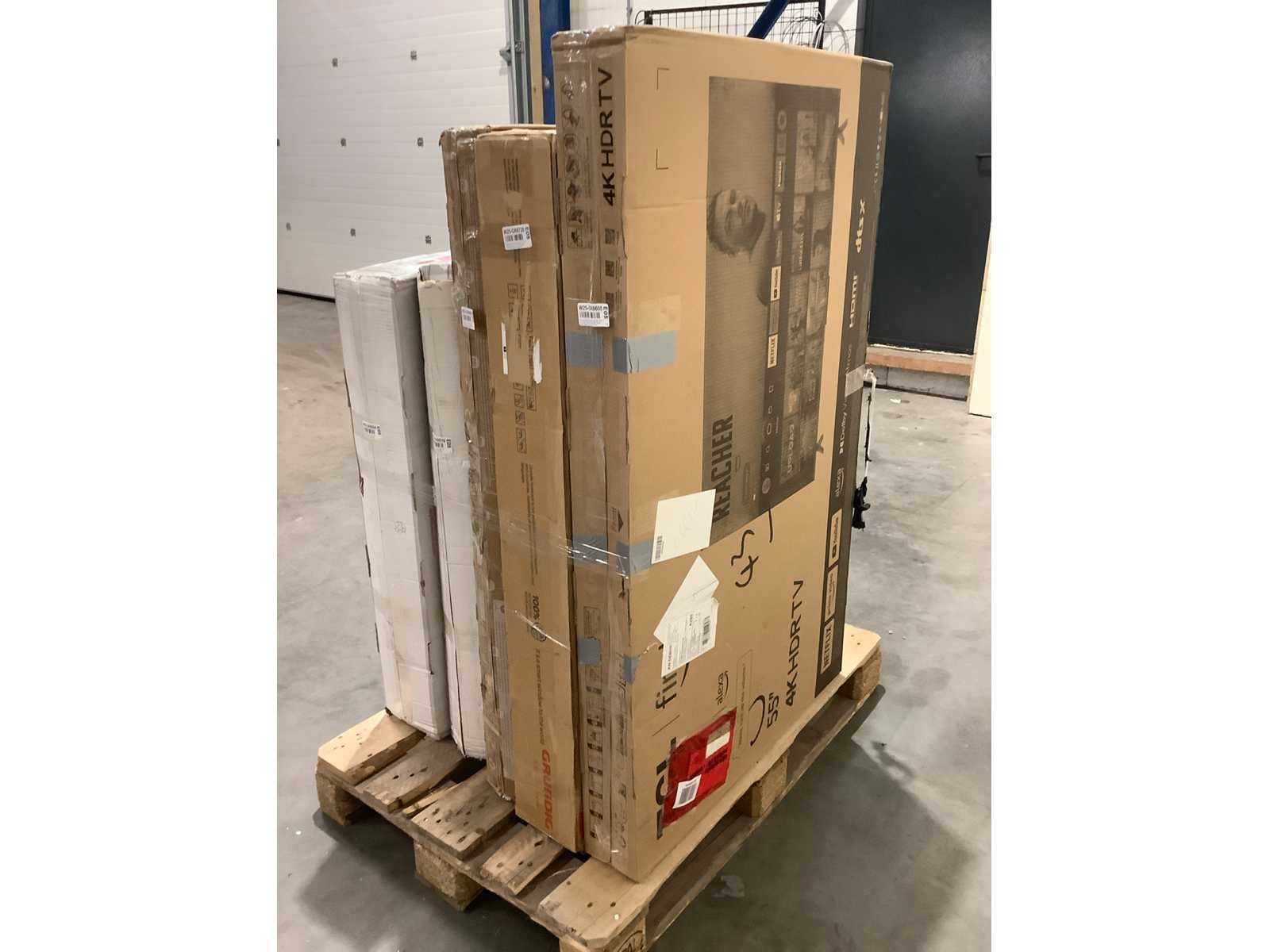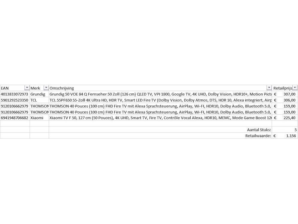 Dit betreft een partij televisies retourgoederen van een grote online retailer. De partij bestaat uit diverse diverse maten televisies. Aantal stuks: 5. Retailwaarde: €1156,- De televisies zijn niet werkend en zijn te gebruiken voor onderdelen. Kom op de kijkdag om te om zo een goed beeld te krijgen van de reden van retour. Zie foto's voor lijst met inhoud. Bezorgtermijn 14 dagen Merk: Pallet Retourgoederen - Televisies