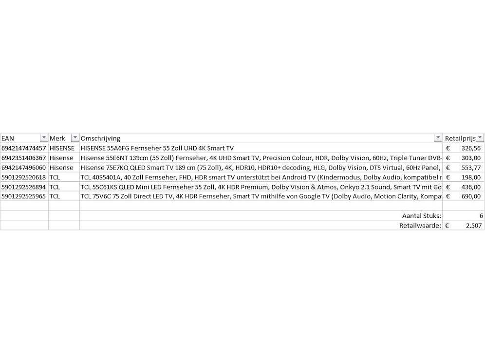 Dit betreft een partij televisies retourgoederen van een grote online retailer. De partij bestaat uit diverse diverse maten televisies. Aantal stuks: 6. Retailwaarde: €2507,- De televisies zijn niet werkend en zijn te gebruiken voor onderdelen. Kom op de kijkdag om te om zo een goed beeld te krijgen van de reden van retour. Zie foto's voor lijst met inhoud. Bezorgtermijn 14 dagen Merk: Pallet Retourgoederen - Televisies