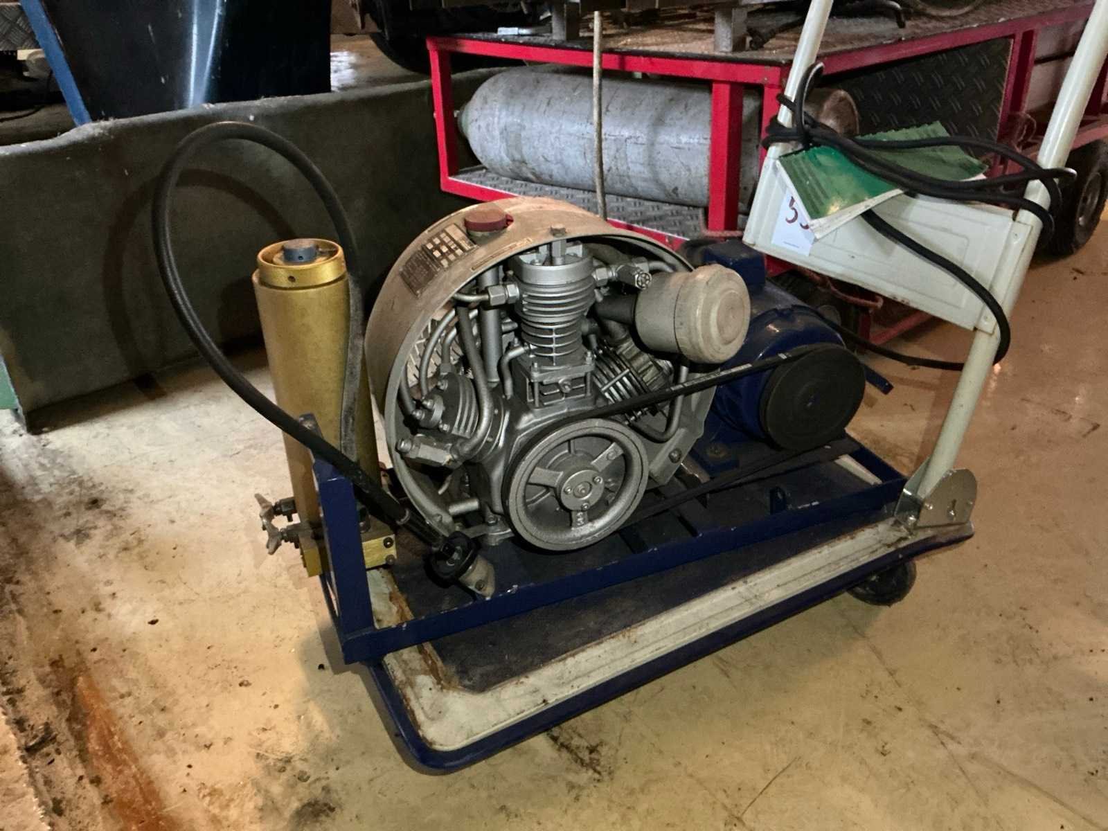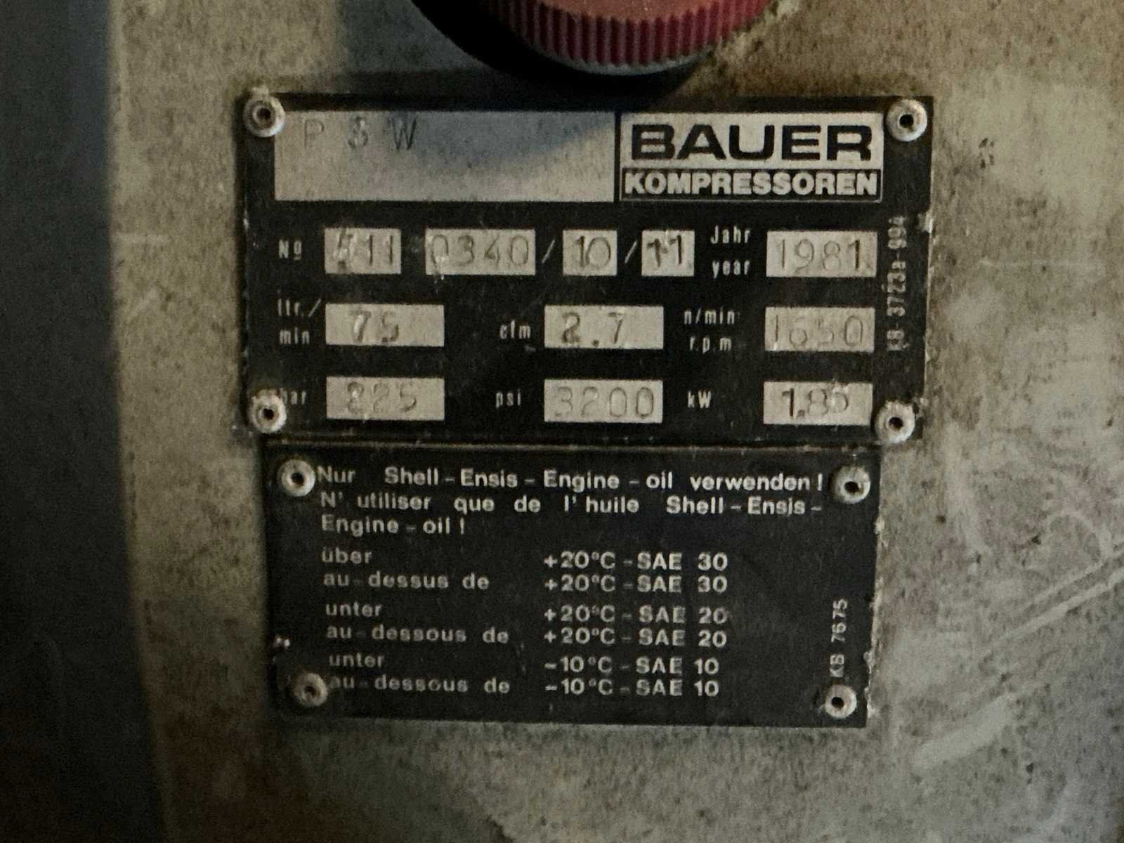 Riem aandrijving, Op kar Merk: Bauer Type: PSW Bouwjaar: 1981 Serienummer: 511 0340 Capaciteit.: 220bar Luchtstroom: 1650l/min Vermogen: 1.8kW Buffertank inhoud: 0.6l Aansluiting: 230V Totale afmeting L: 72mm Totale afmeting Breedte: 350mm Totale afmeting Hoogte: 400mm