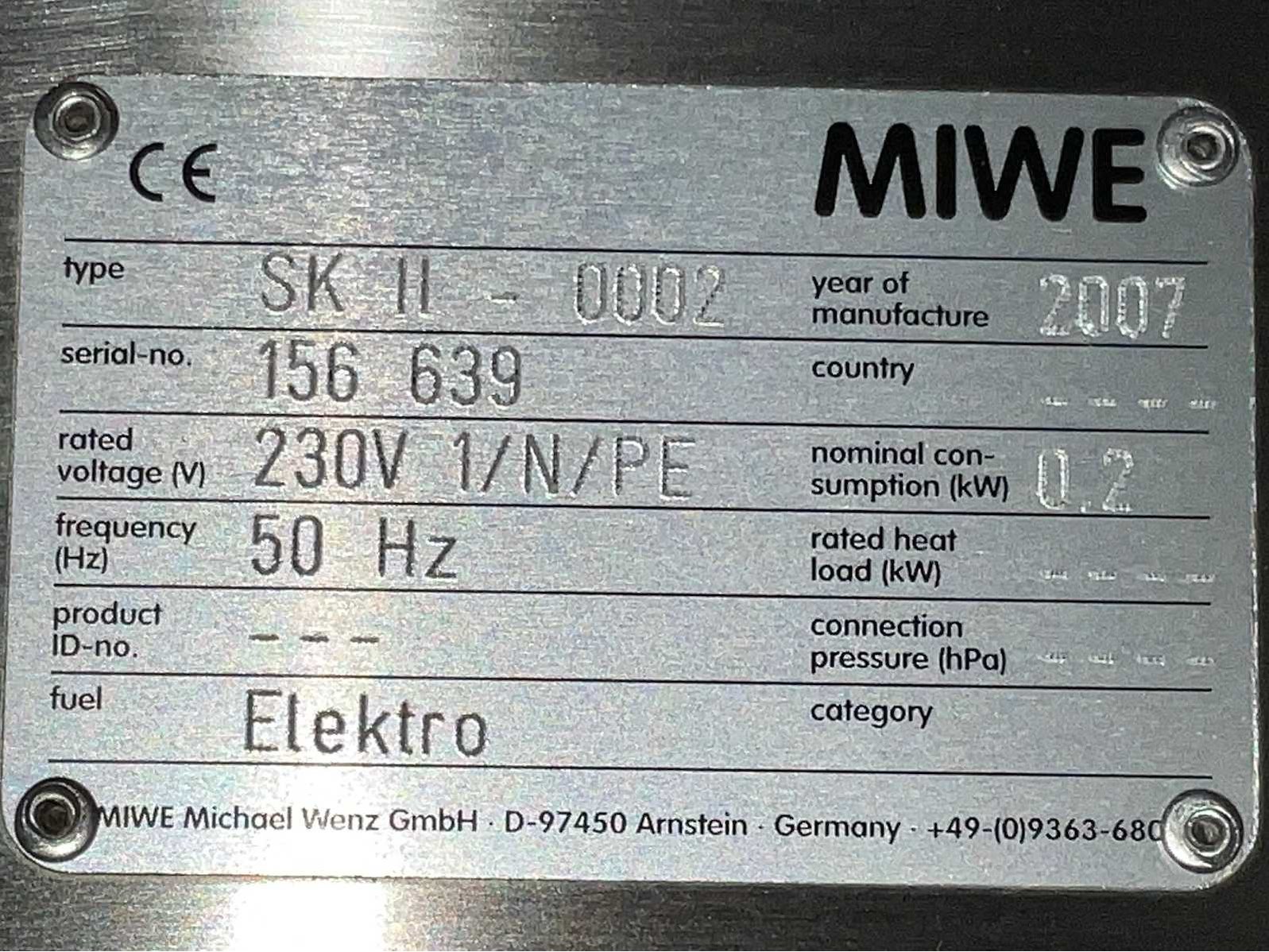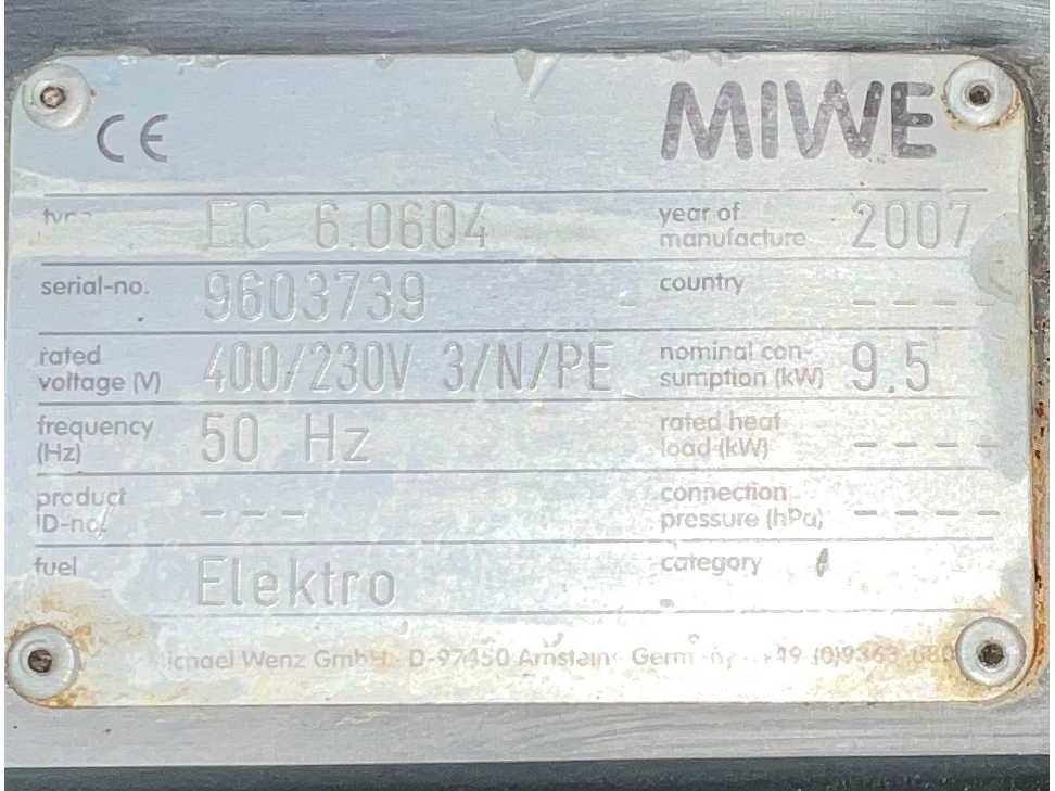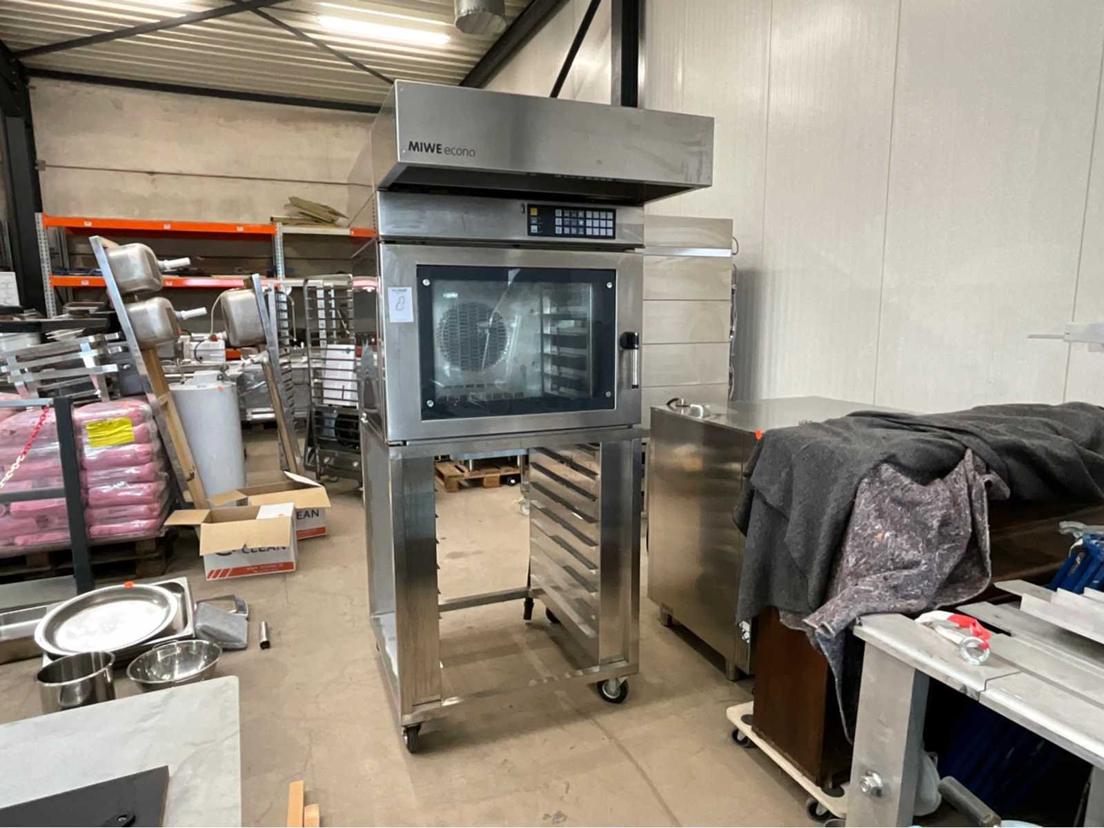 Roestvast staal; voorzien van 1 beglaasde deur; bakkerijnorm 600x400 mm; totaal vermogen 9,5 kW; roestvast staal wasemkap; roestvast staal verrijdbaar regaal onderstel 8 niveaus dubbele bakkerijnorm; Merk: Miwe Type: EC 6.0604 Bouwjaar: 2007 Aantal niveau's: 6 Aansluiting: 400V Totale afmeting L: 900mm Totale afmeting Breedte: 1250mm Totale afmeting Hoogte: 2080mm