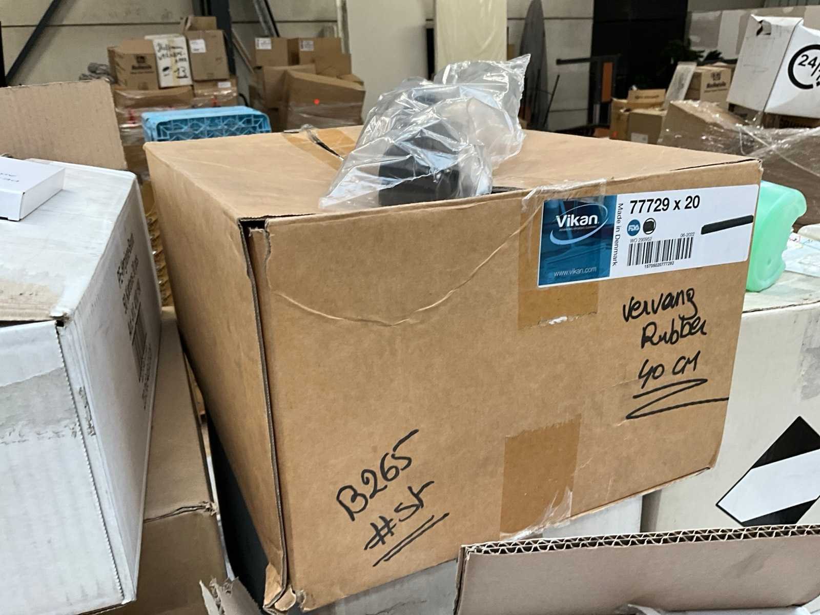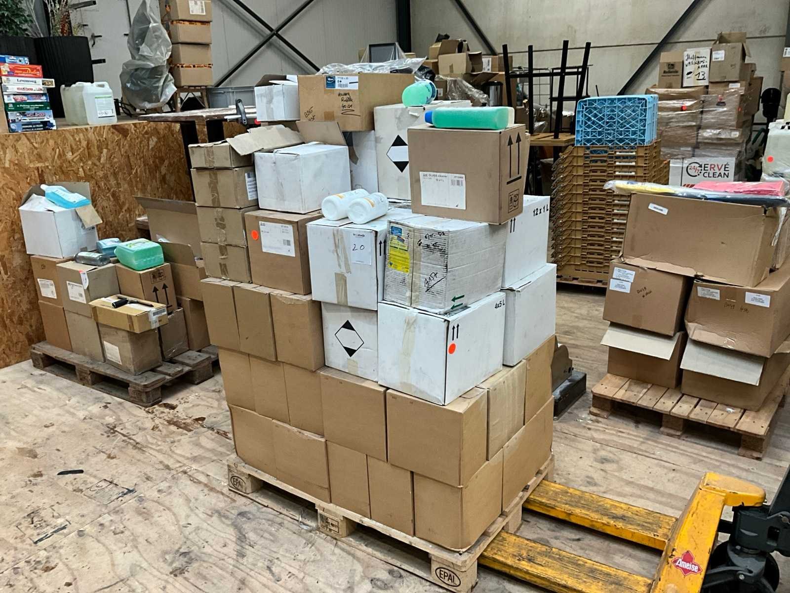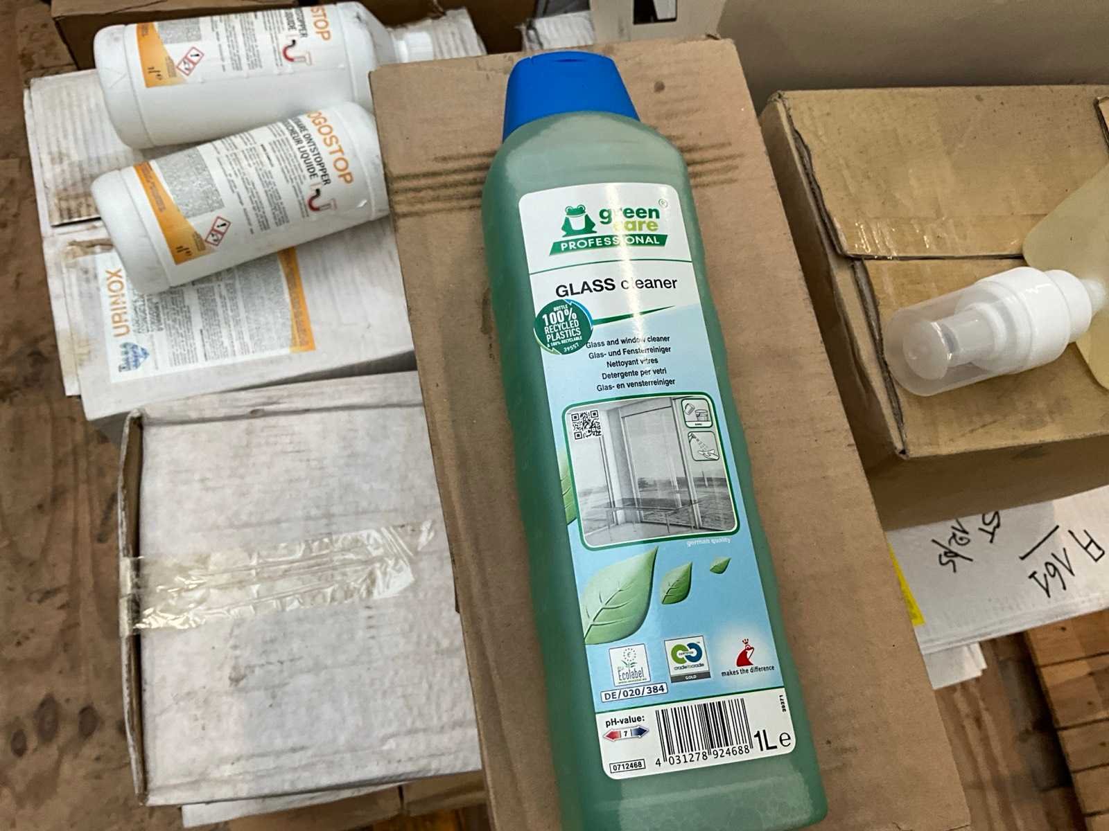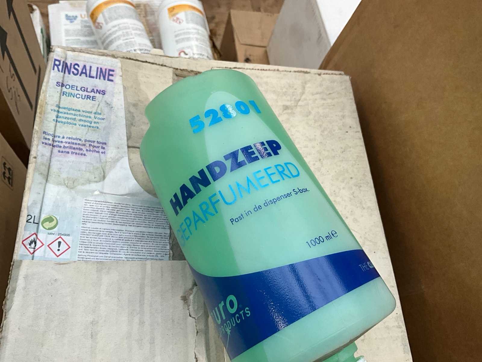 Diverse vloeibare schoonmaakmiddelen, trekker rubbers en plastic zakken