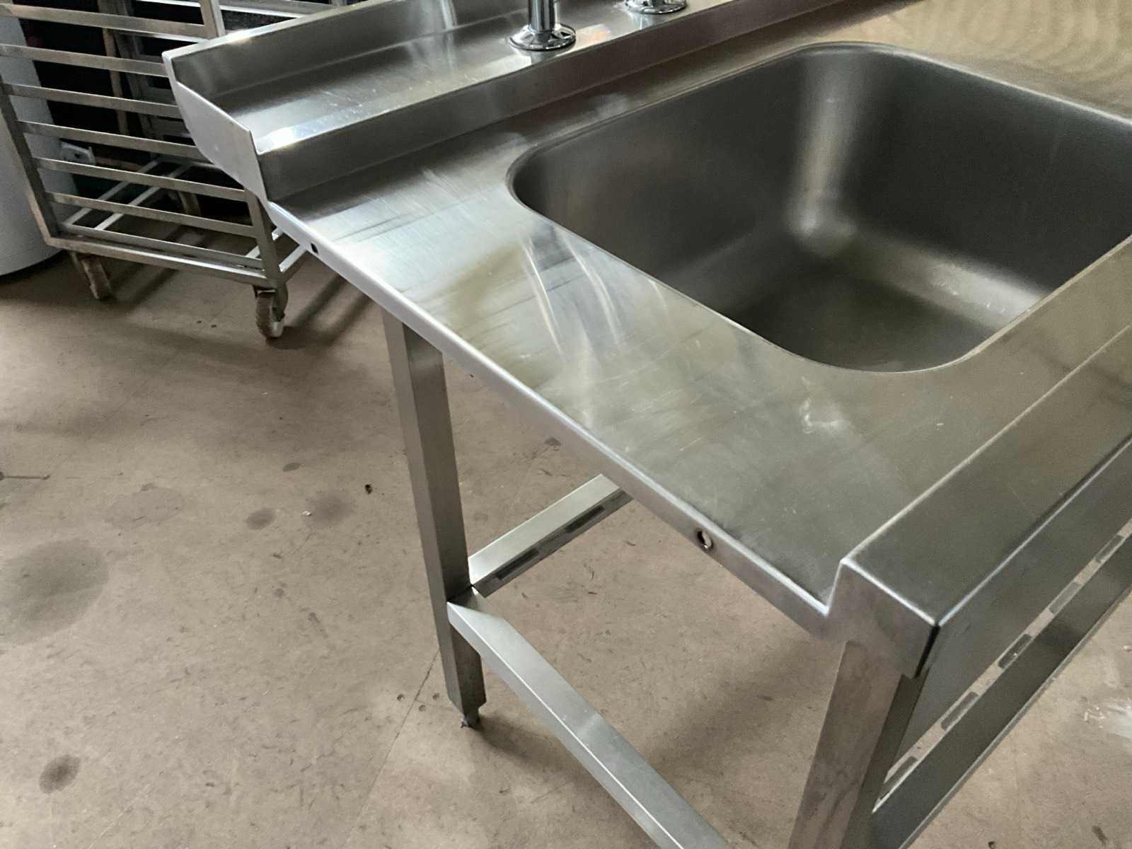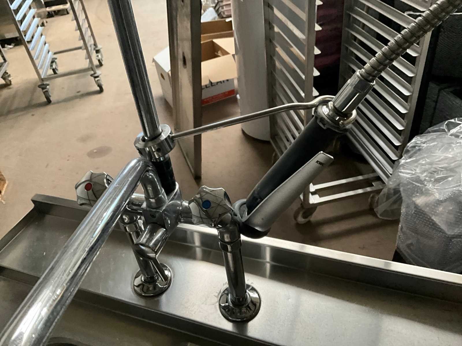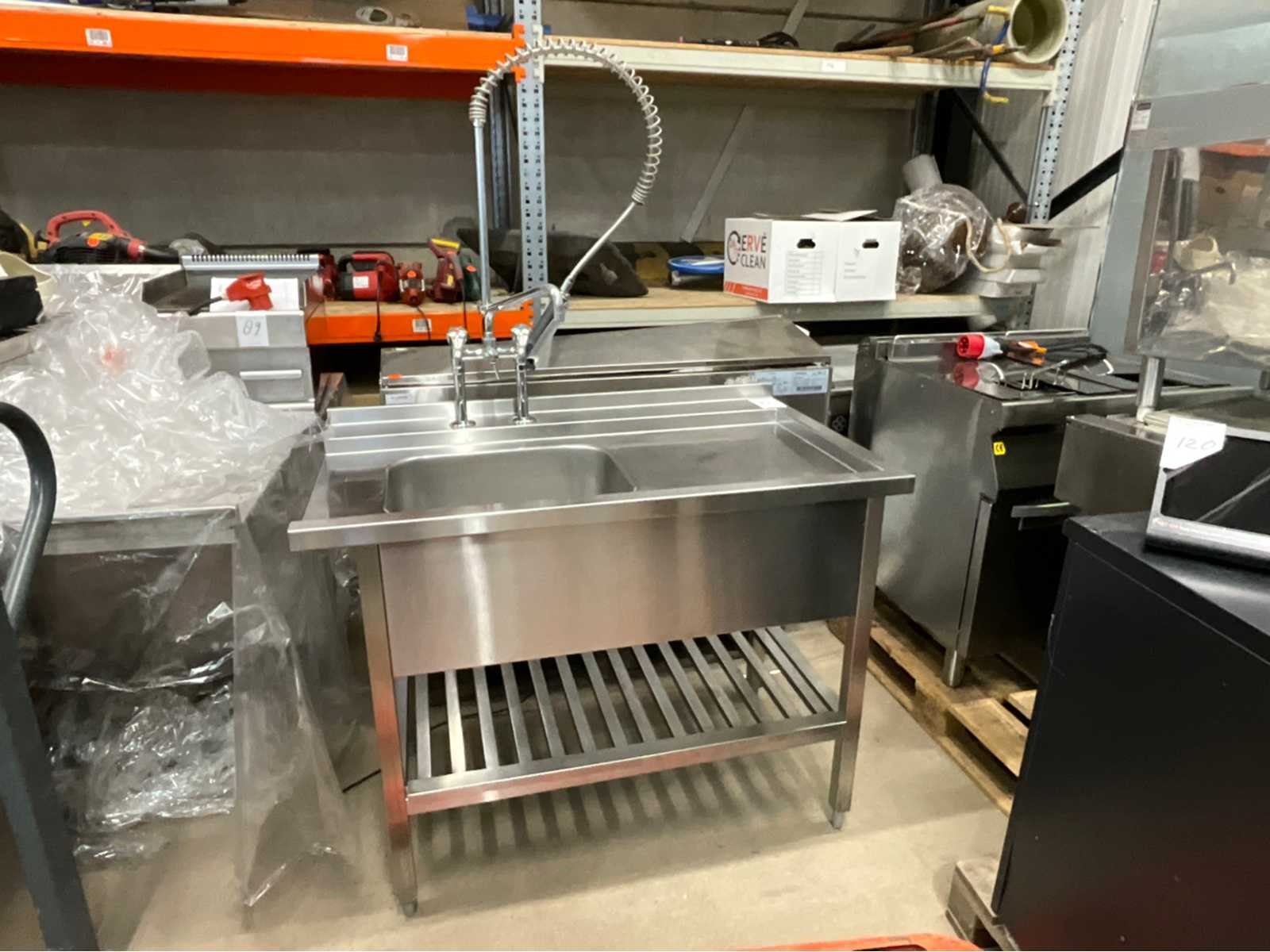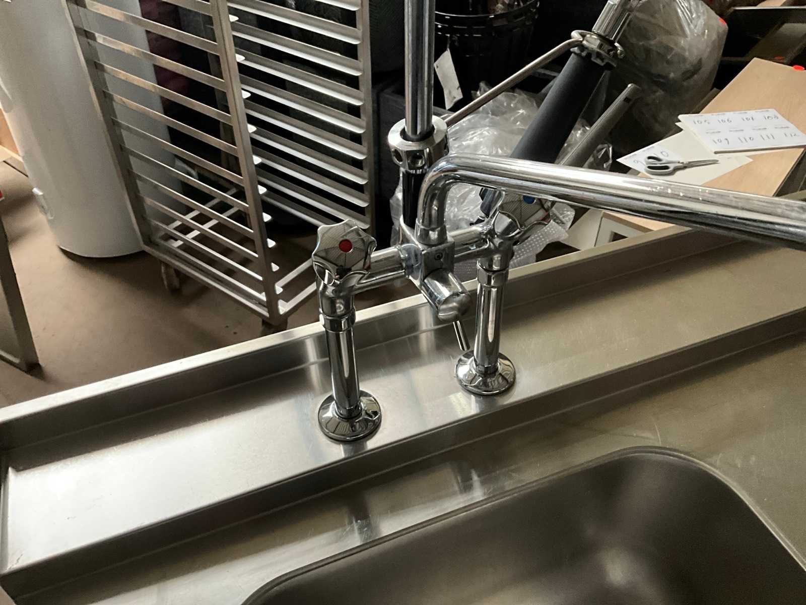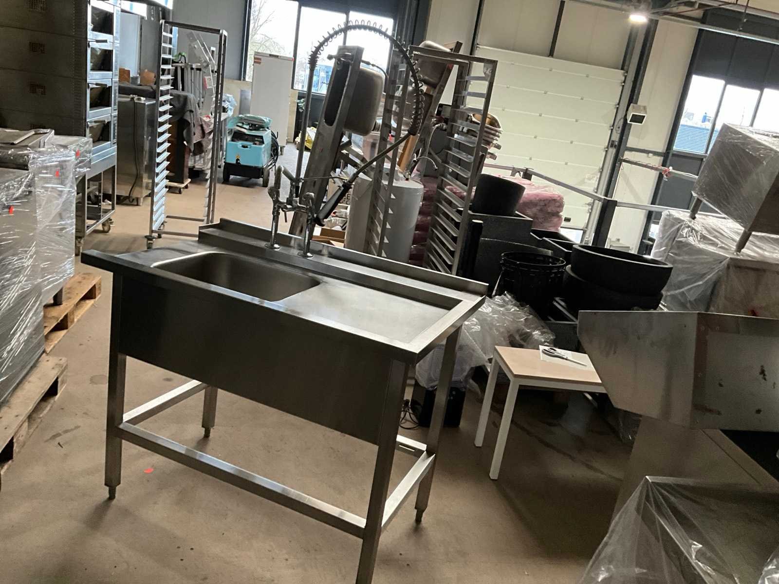 Roestvast staal; kraan met spoeldouche; onderlegrooster; Lengte: 70cm Breedte: 110cm Hoogte: 180cm