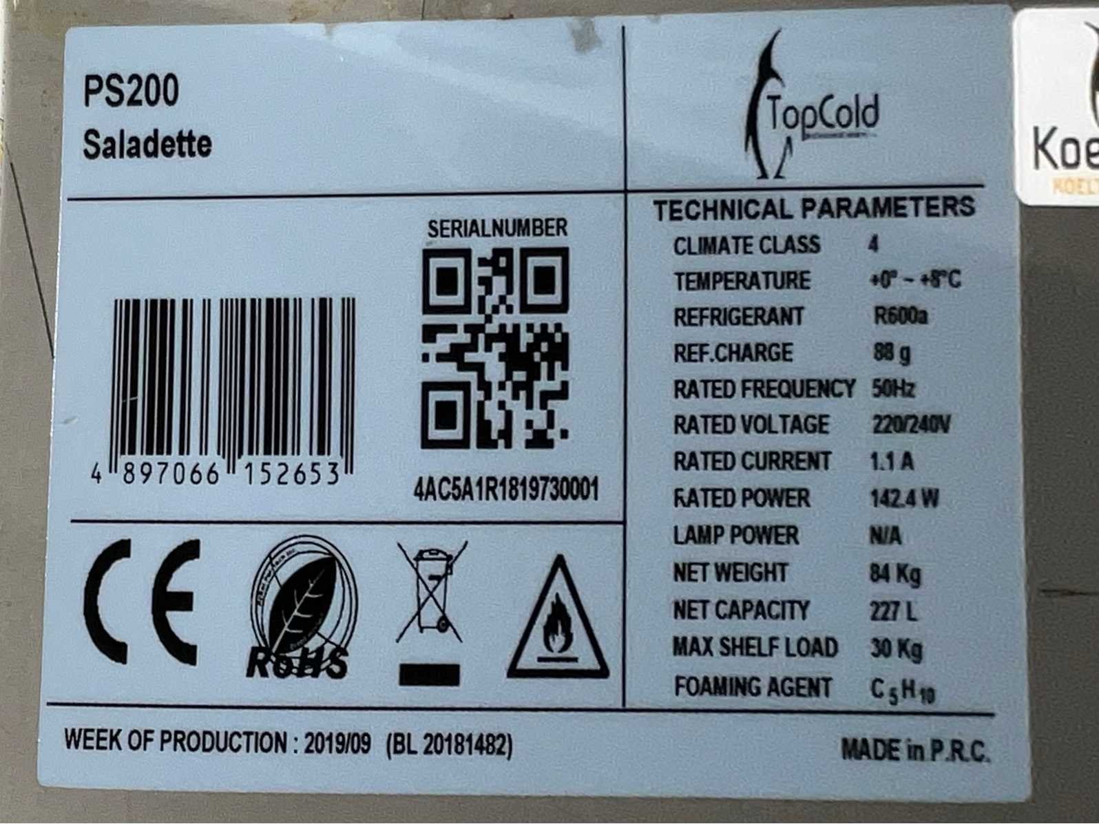 2019 topcold ps200 saladette / koelwerkbank