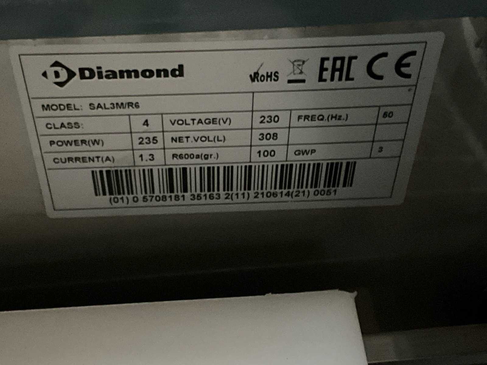 Deuren los aanwezig, rand los aanwezig, 235W, Merk: Diamond Type: SAL3M/R6 Capaciteit.: 308l Rvs: true Aansluiting: 230V Totale afmeting L: 70cm Totale afmeting Breedte: 140cm Totale afmeting Hoogte: 90cm